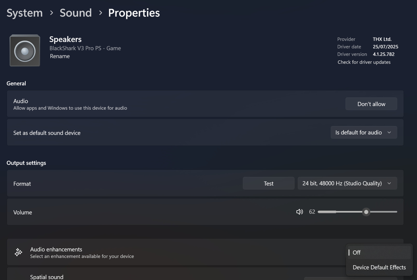 Po drugie, należy też wejść w ustawienia systemu Windows, w opcję dźwięk i zaznaczyć nasze słuchawki (źródło Game). Następnie w opcji Ulepszenia Dźwięku wybrać opcję OFF. Jeśli lubicie, można także pokusić się o włączenie opcji Windows Sonic, bądź Dolby Atmos, to kwestia gustu. Nagle się okazuje, że słuchawki potrafią pięknie grać, tylko dlaczego trzeba tyle się do tego namęczyć, to naprawdę nie wiem.