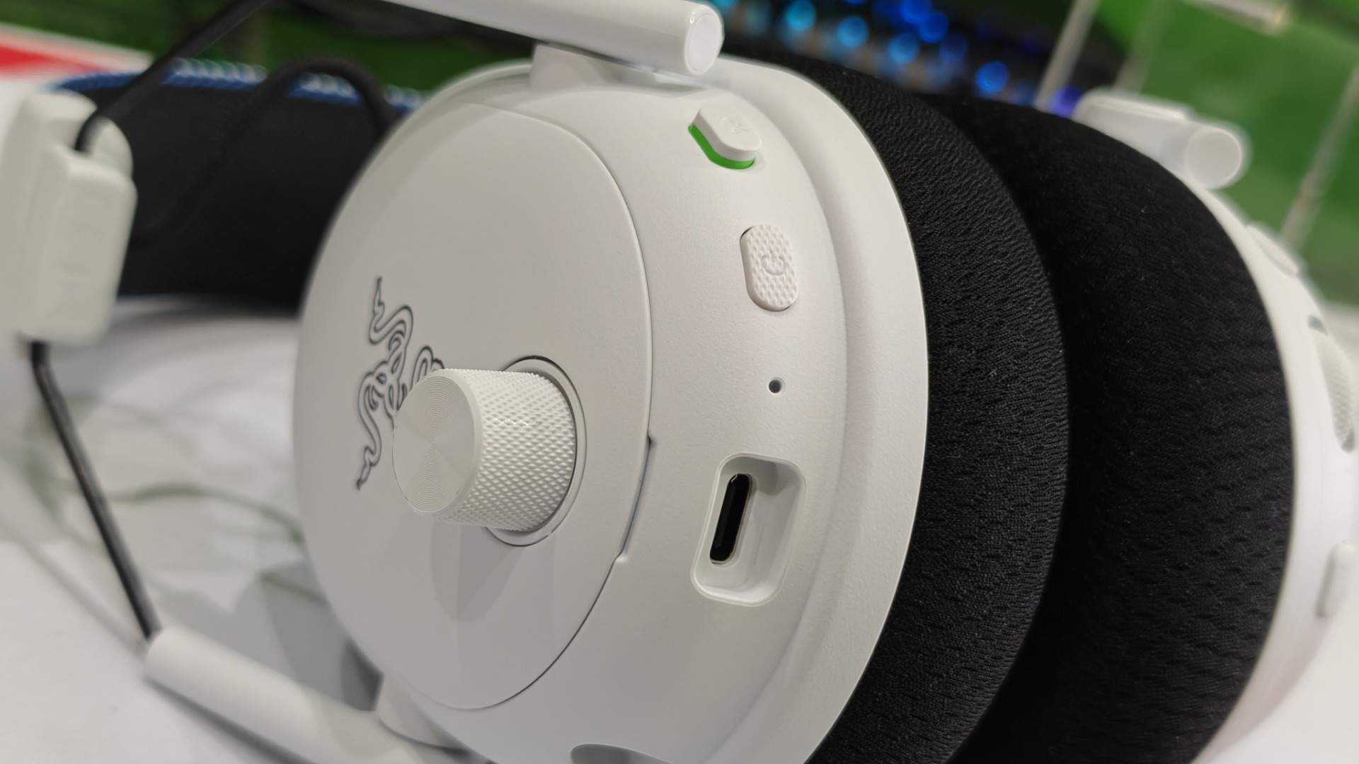 Z lewej strony znajdziemy pokrętło głośności, miejsce na dołączany mikrofon, przycisk POWER, przycisk wyciszania mikrofonu, diodę sygnalizującą pracę urządzenia oraz złącze USB-C do ładowania oraz połączenia kablowgo w razie potrzeby.
