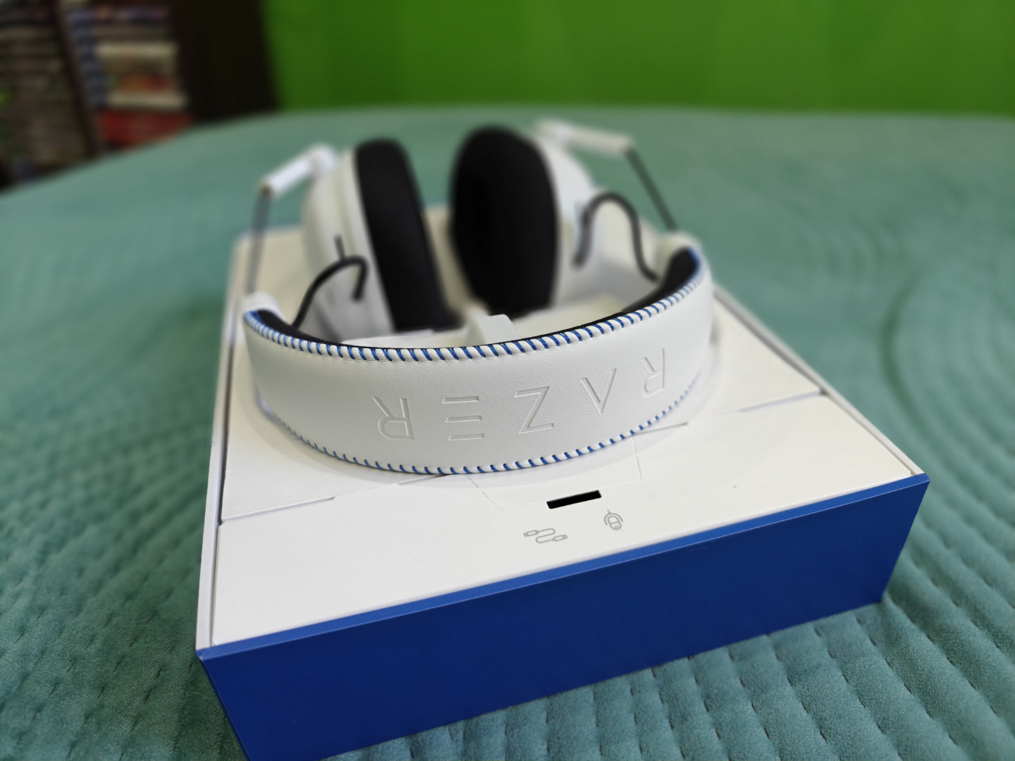 Razer BlackShark V3 Pro to słuchawki o konstrukcji zamkniętej. Nasza wersja jest dedykowana PlayStation i została wyposażona w motyw kolorystyczny zgodny z tym sprzętem. Mamy więc do czynienia z białym wykończeniem i niebieskimi wstawkami. Niektóre elementy pozostały jednak zielone, bo to właśnie kolor zielony jest wizytówką firmy RAZER.