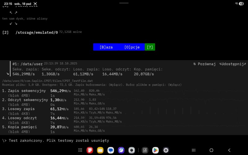 Cross Platform Disk Test ma na celu sprawdzenie wydajności szybkości wejścia i wyjścia pamięci stałej oraz pamięci systemowej. Innymi słowy sprawdza RAM, ROM oraz szybkość odczytu i zapisu dla pamięci zewnętrznej, w postaci karty microSD. Samsungowy tablet spisał się tutaj wzorowo.