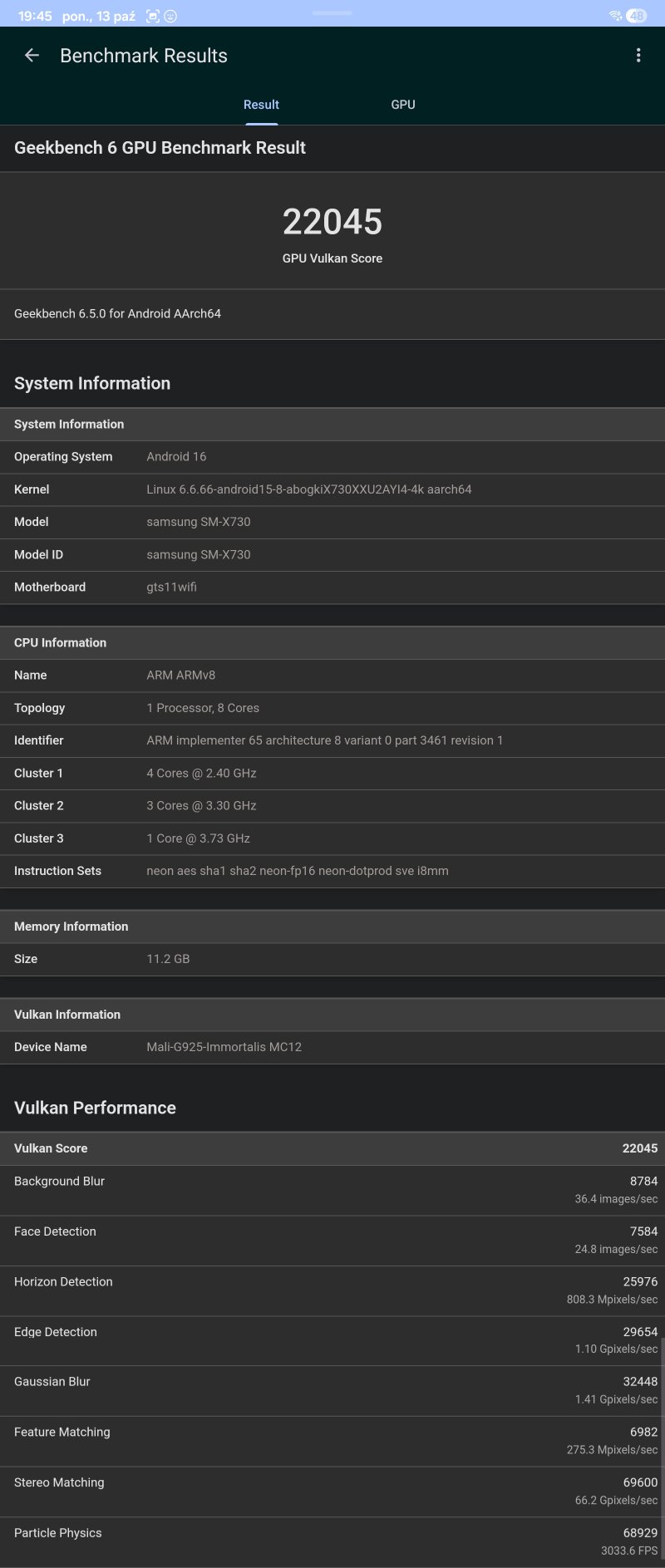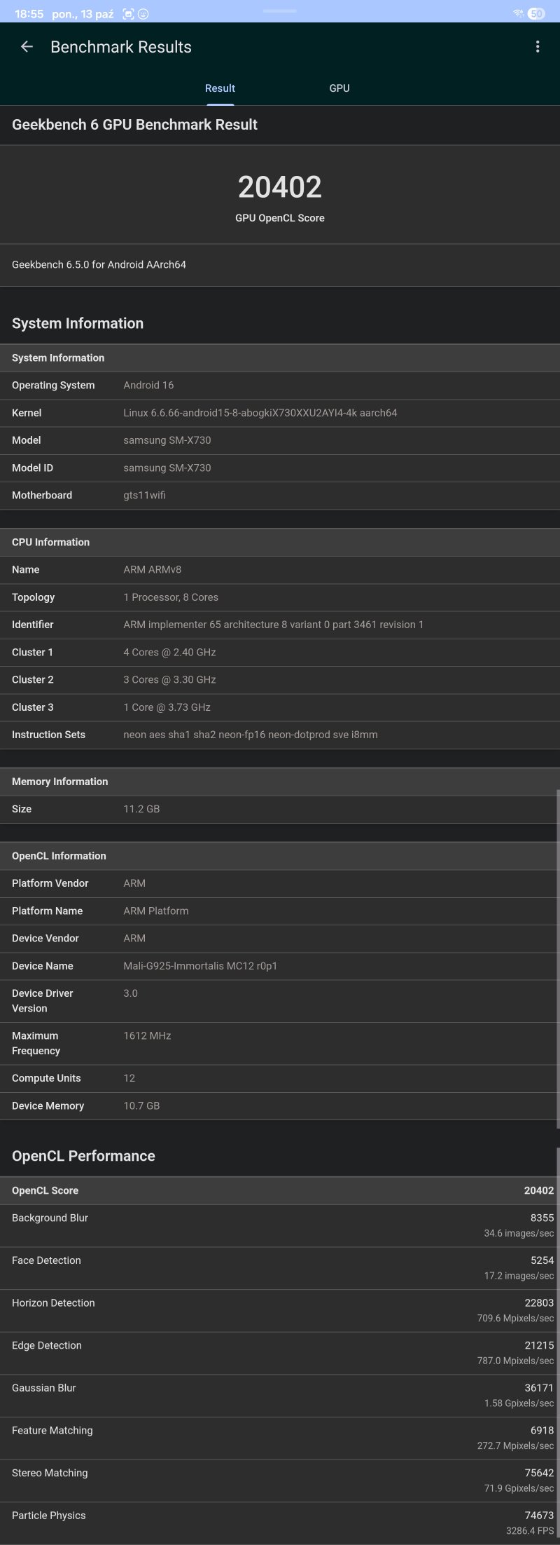 Teraz pewnie niektórzy doznają szoku, ale tak, tablety oraz smartfony mają swoje układy graficzne, które odpowiadają za (niespodzianka) wyświetlanie obrazu na ekranie. Geekbench sprawdza także jego możliwości w zakresie gamingu, przetwarzania obrazu lub edycji wideo w standardzie OpenCL, Metal oraz Vulkan. Poniżej wyniki dla benchmarku odpalonego w OpenCL.