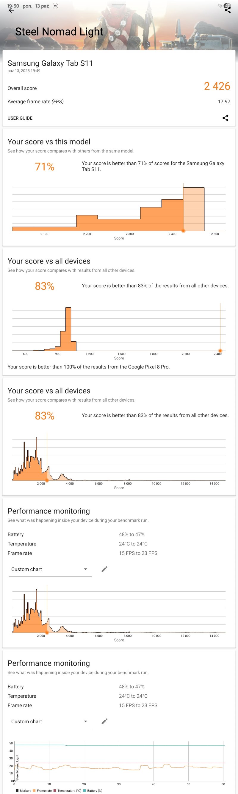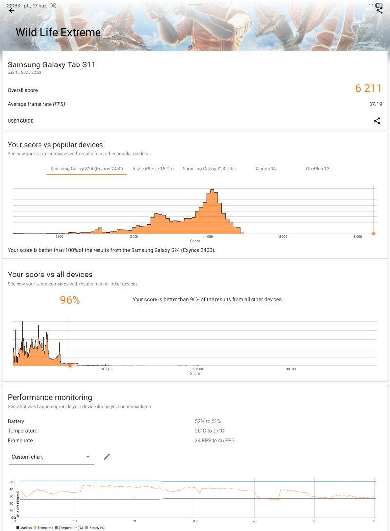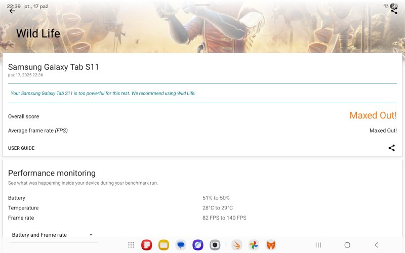 No, a przynajmniej jeśli chodzi o kwestie graficzne i wydajnościowe, ponieważ testów wszelakich mamy tutaj od groma. Tak, odpaliłem niemal wszystkie, nie, nie miało to najmniejszego sensu, ale jeżeli chociaż jedną osobę zainteresuje którykolwiek z tych wyników, to uznam, że było warto. Zacznijmy może od Wild Life, który wprost poinformował mnie, że Samsung Galaxy Tab S11 jest zbyt potężnym sprzętem, żeby z niego korzystać. Tak samo, jak Sling Shot, którego nawet nie odpalałem.