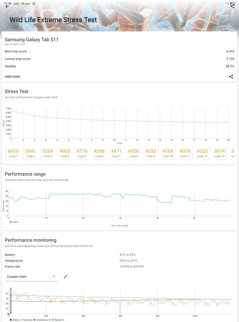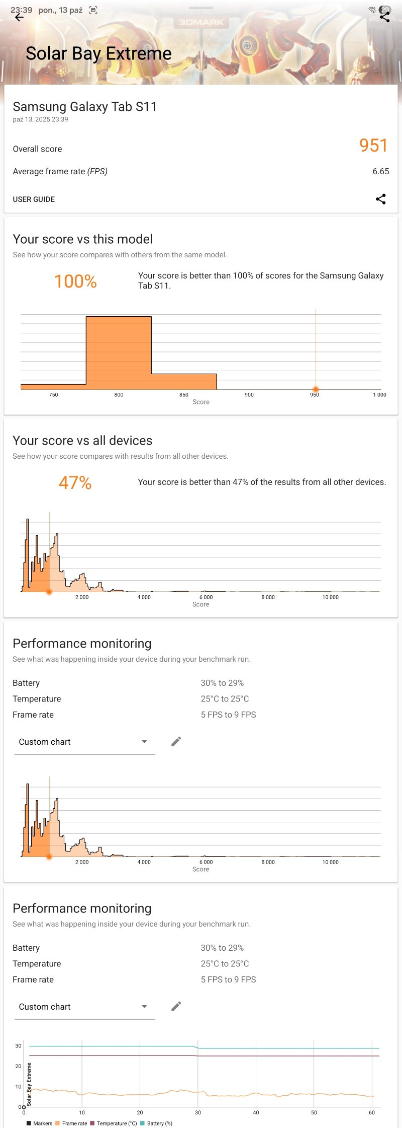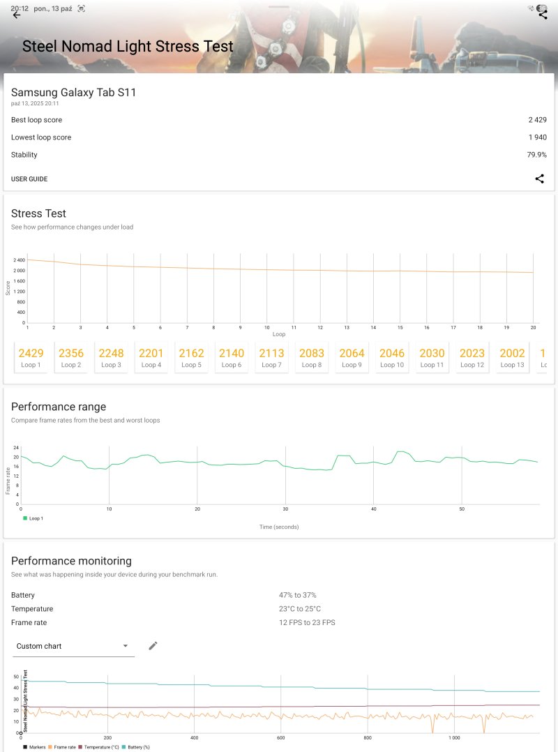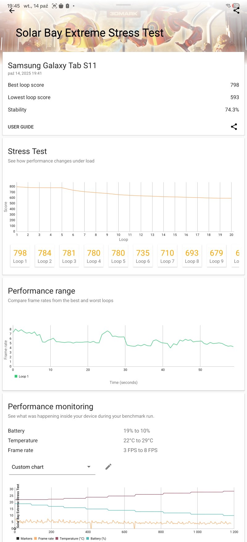 To samo co wyżej, tylko 20 razy z rzędu, co oznacza bardzo wymagające dla sprzętu warunki i tutaj faktycznie Samsung Galaxy Tab S11 się nieco ugiął. Każda kolejna pętla otrzymywała gorszy wynik od poprzedniej, a temperatura procesora podczas tego procesu zwiększyła się aż o 7 stopni. Poziom naładowania baterii natomiast spadł o 9%.