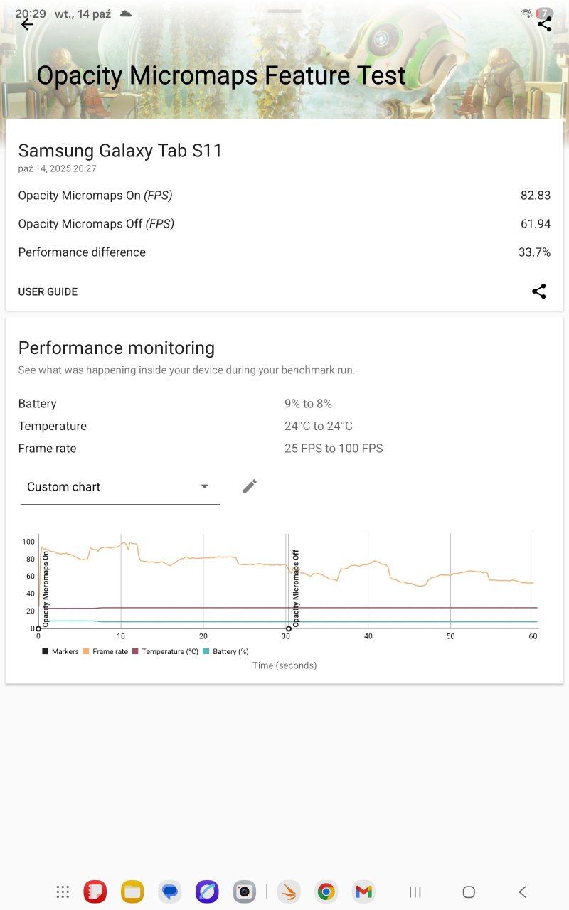 Wszystkie zostały ustawione w taki sposób, by preferować najlepszą grafikę ponad wydajność czy oszczędzanie baterii. Słowem, najcięższe możliwe ustawienia, które mają na celu wyciśnięcie siódmych potów z testowanego sprzętu. Muszę przyznać, że osoby, które zdecydują się na zakup Samsunga Galaxy Tab S11, raczej nie będą miały powodów do narzekania.