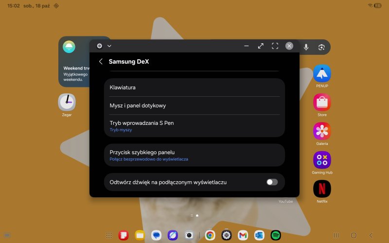 Obecnie chyba urządzenia tylko dwóch producentów mają rozpoznawalne i dopracowane tryby dedykowane korzystaniu z zewnętrznego ekranu. Motorola ze swoim Ready For oraz Samsung DeX, którego nie mogło zabraknąć również i w Galaxy Tab S11. Po podłączeniu za pomocą USB-C do innego wyświetlacza (w moim przypadku do monitora), opcja DeX załącza się automatycznie.