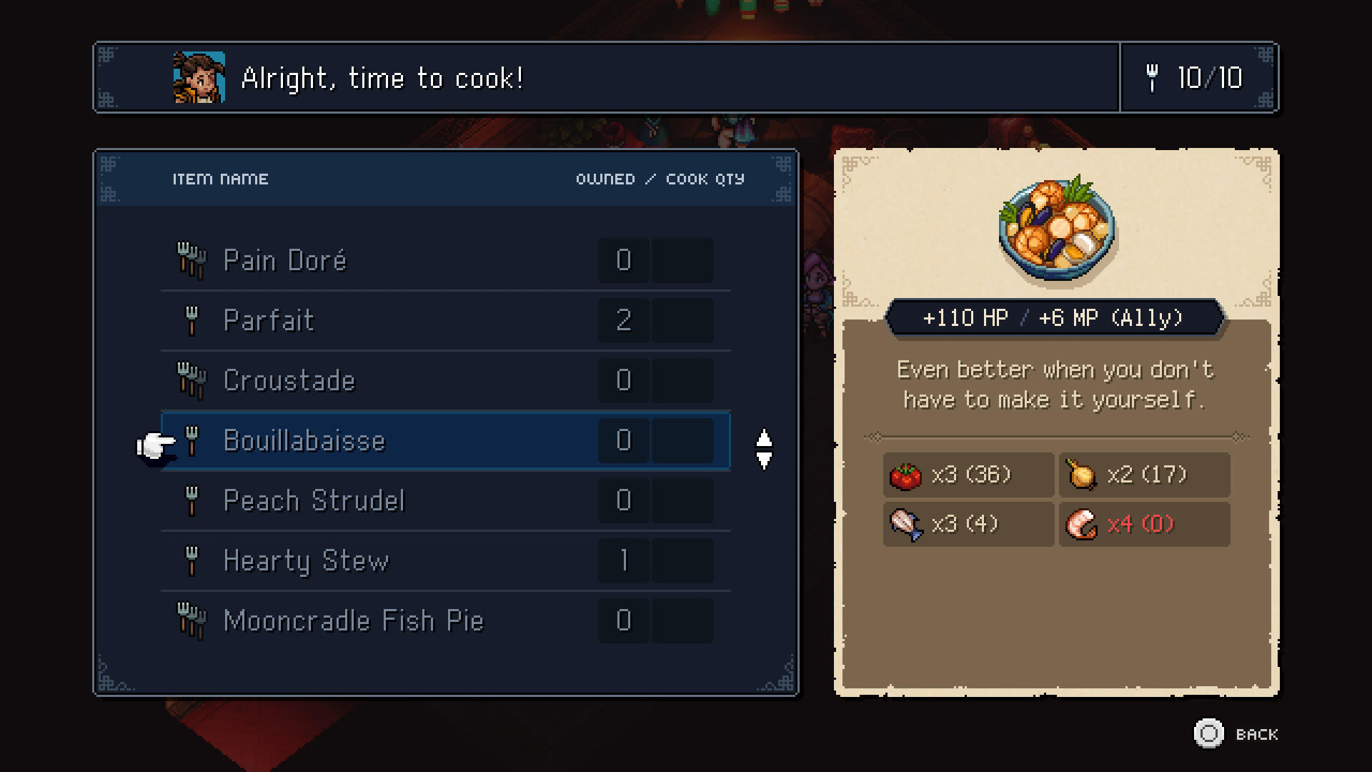 Wspominając raz jeszcze o gotowaniu, warto nadmienić, że niezbędne do potraw będą konkretne składniki, które są rozsiane po świecie. Możemy też je zakupić u handlarzy, co jednak odradzam, gdyż złoto bardziej przyda się na relikty i lepszy sprzęt, a za każdorazowym odwiedzeniem tej samej lokacji możemy żywność zebrać na nowo (warto pamiętać, że nie wszędzie znajdziemy to samo, niektóre potrawy są niemal niezbędne przy trudniejszych starciach, więc warto się dobrze zaopatrzyć przed walką).Każdy typ gotowanych potraw ma własną mini animację w menu gotowania, od patrzenia aż ślinka cieknie, po prostu genialne!