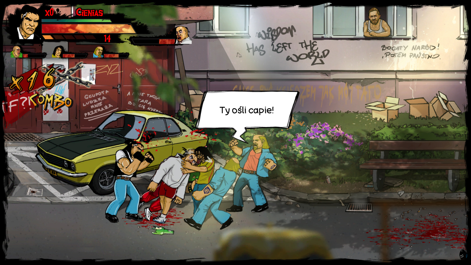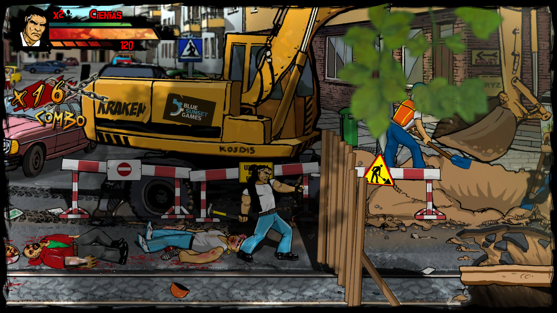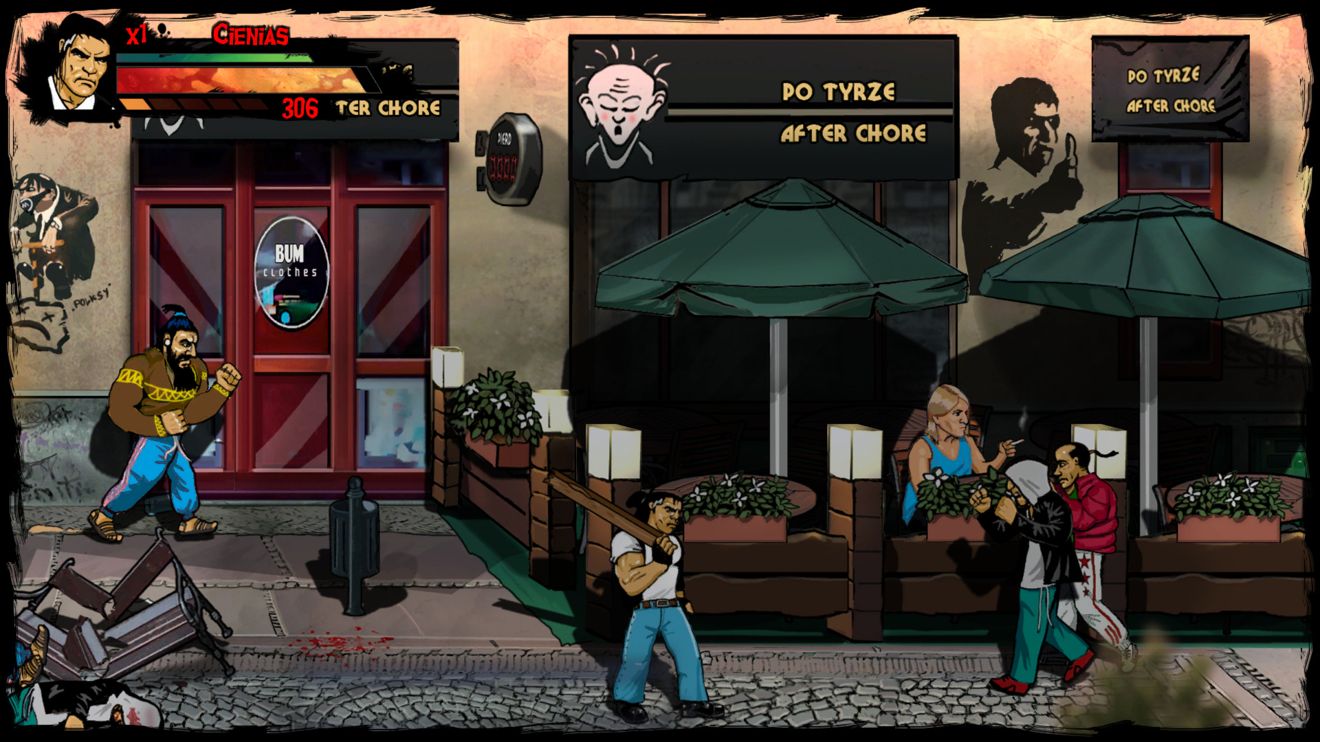 Gra wita nas ciekawym projektem graficznym, ponieważ wszystko, co widzimy na ekranie, zostało ręcznie narysowane oraz animowane. Muszę przyznać, że robi to dobre wrażenie i nadaje grze charakteru. Tła zawierają mnóstwo detali, a użyta paleta kolorów, przypomina klimaty starych rodzimych blokowisk. Animacje ciosów, kopnięć czy chwytów, są wykonane bardzo ładnie i te sierpowe... piękne są! Czuć moc w tych uderzeniach i aż micha się cieszy gdy spuszczamy łomot napotkanym przeciwnikom. Szczególnie kreatywnie twórcy podeszli do wizerunków bossów. Każdy z nich jest unikatowy i jest świetnie przerysowanym stereotypem odnoszącym się do pewnych zachowań czy pracy zawodowej. Bardzo spodobał mi się design większości przeciwników, ale wizerunki tych głównych oponentów wywarły na mnie szczególne wrażenie. Czym jednak byłaby taka sieczka bez solidnej oprawy muzycznej? W rytm spuszczania bęcków, przygrywa nam żywiołowa muzyka, która nieźle wpasowuje się klimat mordobicia. Ścieżka dźwiękowa jest tutaj perfekcyjnie dobrana.