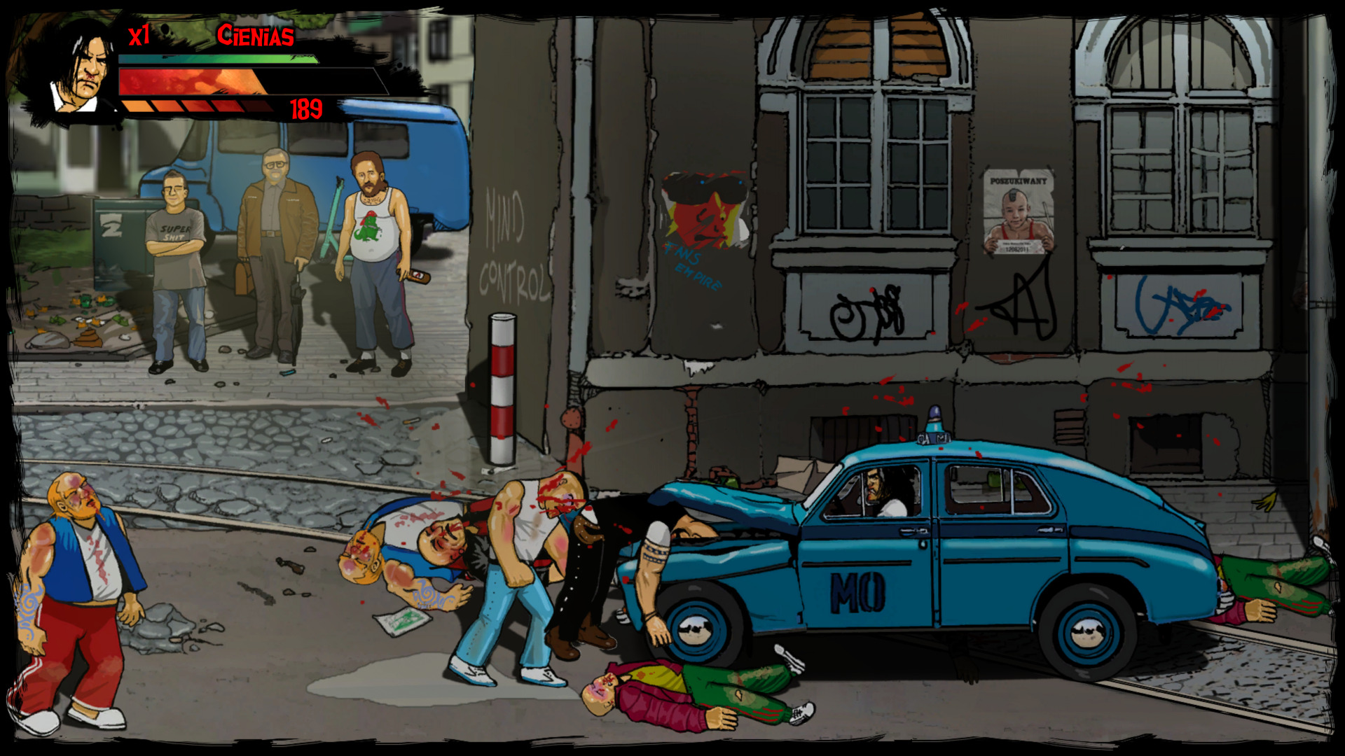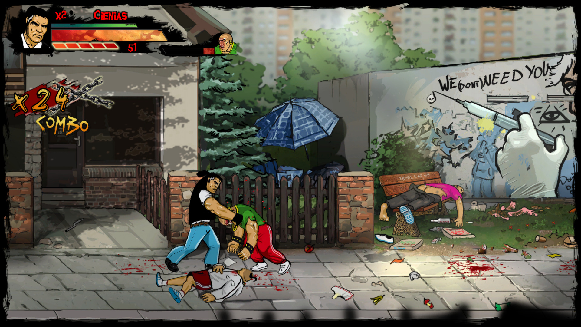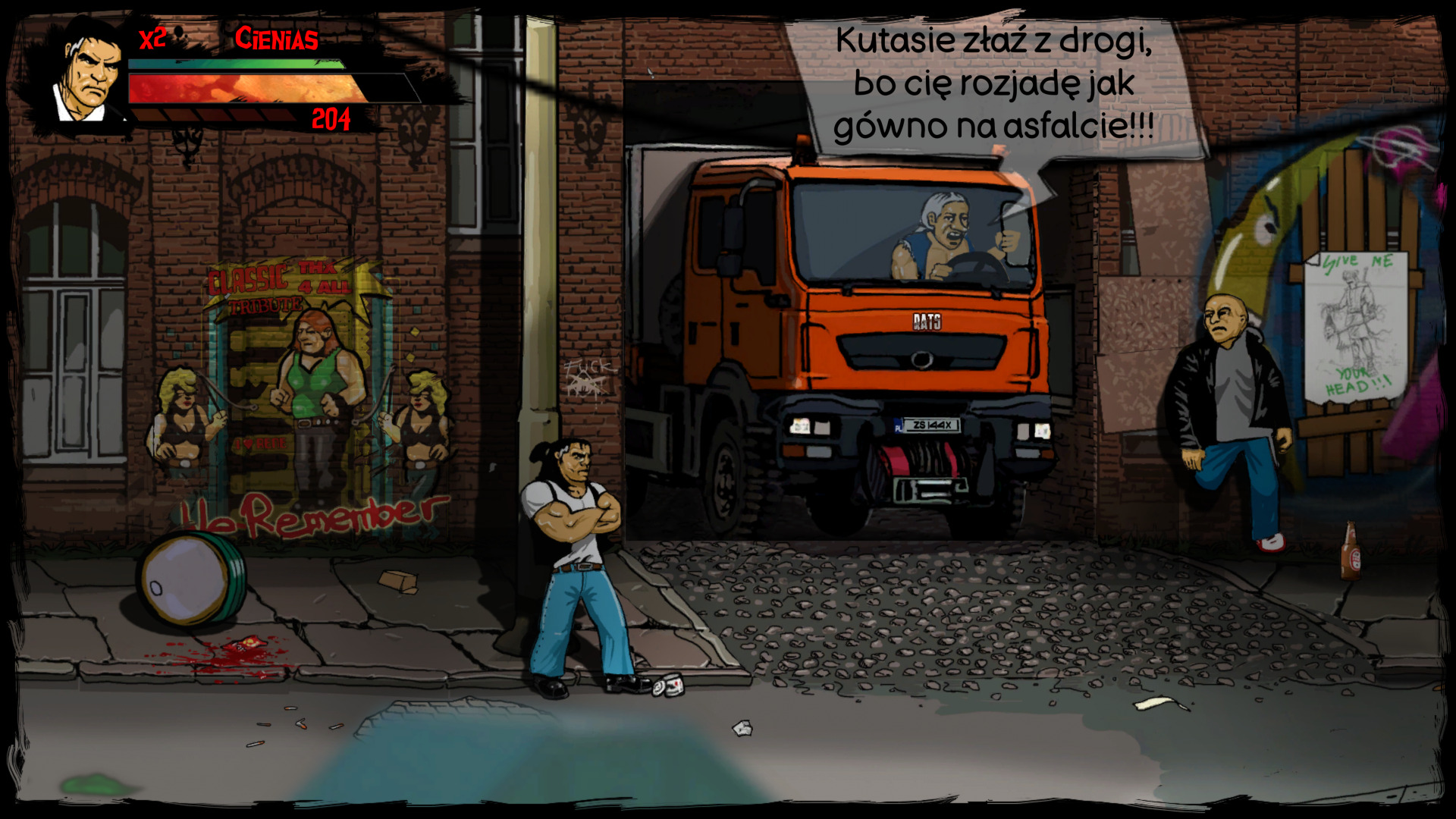 Gra wita nas ciekawym projektem graficznym, ponieważ wszystko, co widzimy na ekranie, zostało ręcznie narysowane oraz animowane. Muszę przyznać, że robi to dobre wrażenie i nadaje grze charakteru. Tła zawierają mnóstwo detali, a użyta paleta kolorów, przypomina klimaty starych rodzimych blokowisk. Animacje ciosów, kopnięć czy chwytów, są wykonane bardzo ładnie i te sierpowe... piękne są! Czuć moc w tych uderzeniach i aż micha się cieszy gdy spuszczamy łomot napotkanym przeciwnikom. Szczególnie kreatywnie twórcy podeszli do wizerunków bossów. Każdy z nich jest unikatowy i jest świetnie przerysowanym stereotypem odnoszącym się do pewnych zachowań czy pracy zawodowej. Bardzo spodobał mi się design większości przeciwników, ale wizerunki tych głównych oponentów wywarły na mnie szczególne wrażenie. Czym jednak byłaby taka sieczka bez solidnej oprawy muzycznej? W rytm spuszczania bęcków, przygrywa nam żywiołowa muzyka, która nieźle wpasowuje się klimat mordobicia. Ścieżka dźwiękowa jest tutaj perfekcyjnie dobrana.
