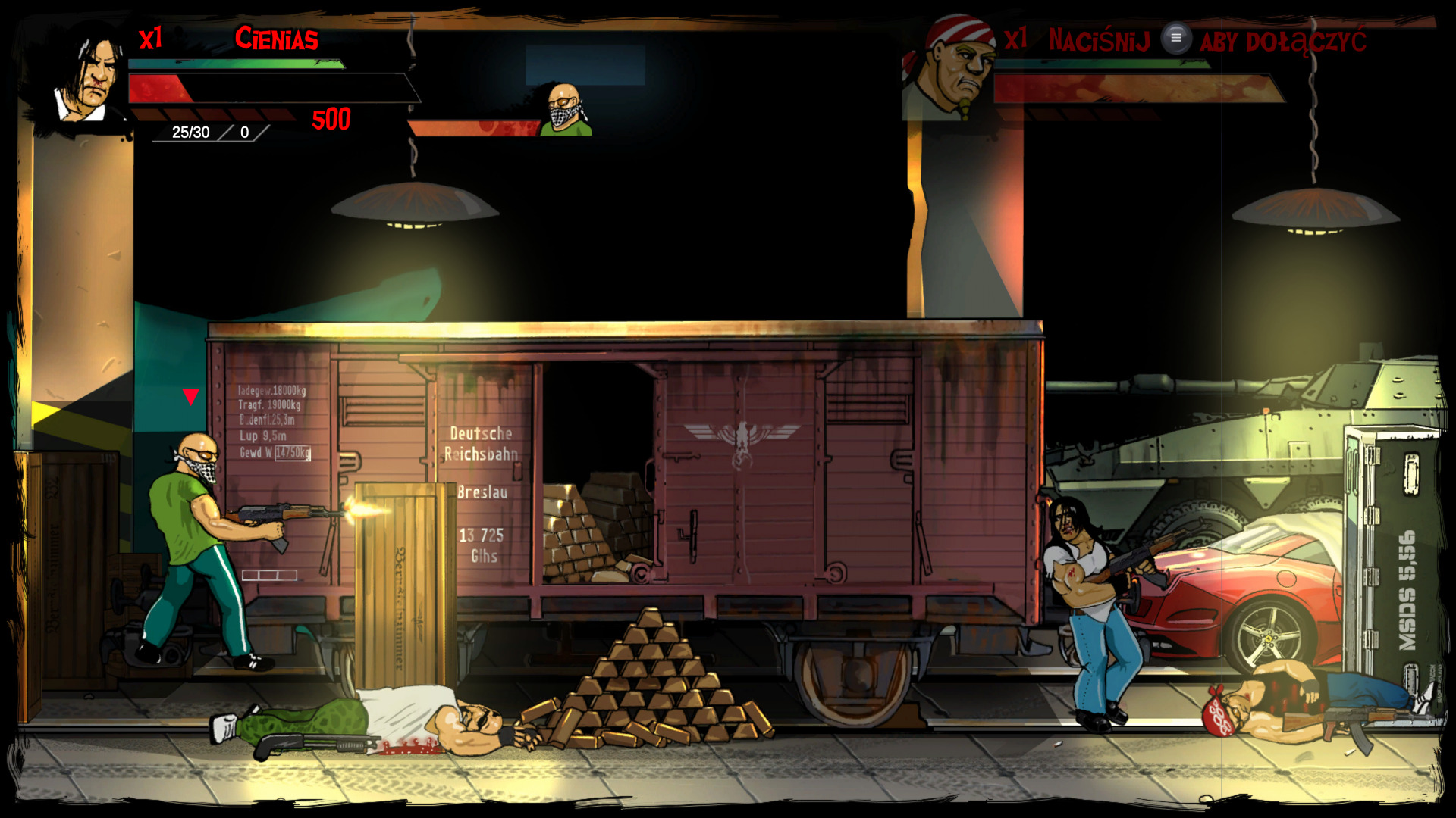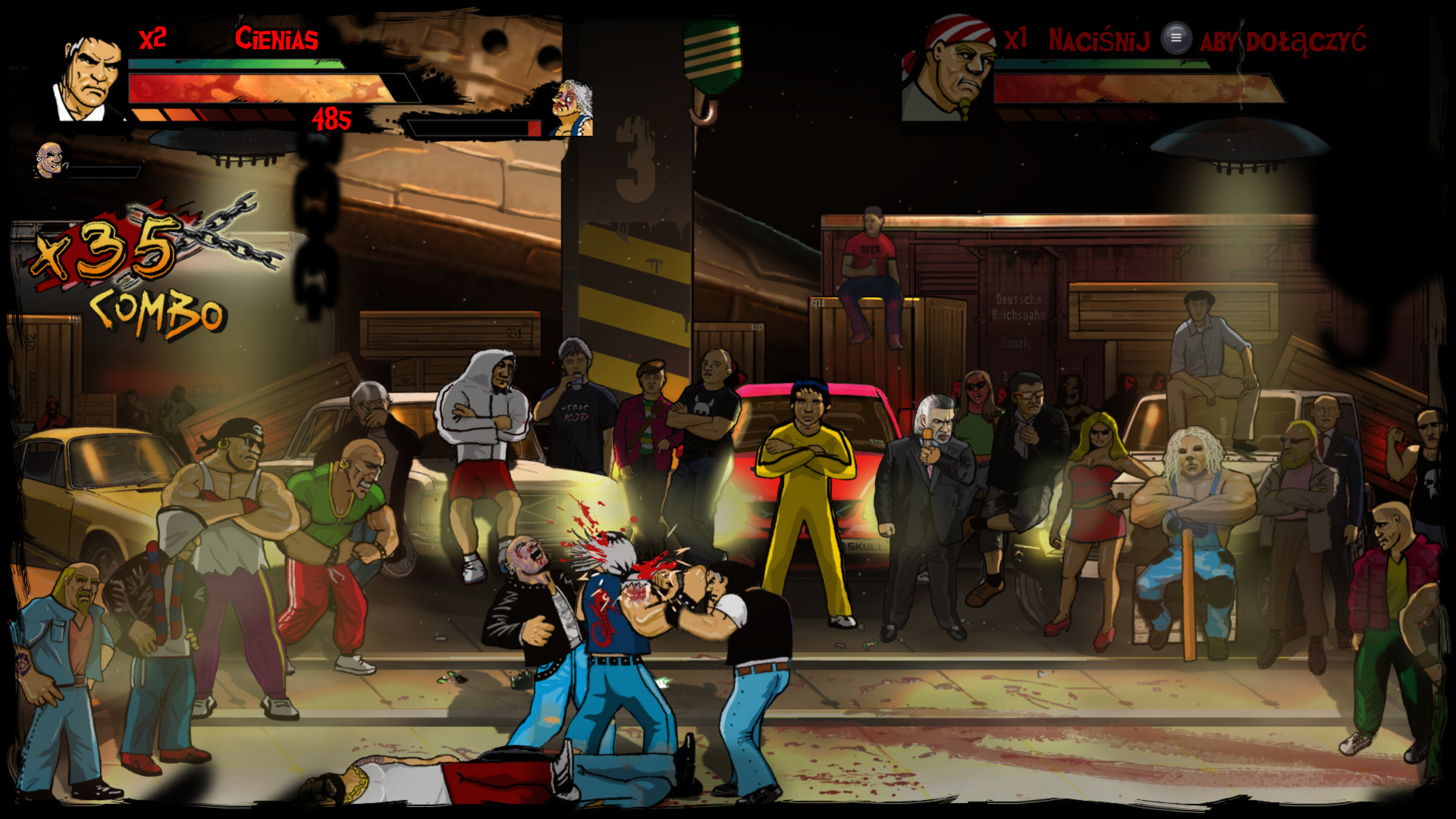 "Skinny & Franko: Fists of Violence" oferuje grę w trybie lokalnej współpracy, czyli tzw. kanapowe granie. Choć grę przeszedłem sam, myślę, że z kompanem ten tytuł zyskałby znacznie na grywalności. Współpraca ze znajomym może dać tutaj dużo frajdy i mocno zmienić rozgrywkę. Niestety gra nie posiada trybu współpracy online. Muszę jeszcze wspomnieć o polskiej lokalizacji, z którą mam pewien problem... Gra jest w pełni spolszczona i posiada nawet polski dubbing, ale jest on niezwykle hmm... specyficzny. Gdy usłyszałem go pierwszy raz, to dosłownie czułem się zażenowany, ale z biegiem czasu, zrozumiałem, że chyba tak miało być. Cała gra jest prześmiewcza i każdy stereotyp z typowego blokowiska jest tutaj znacznie przerysowany, więc i wypowiadane kwestie przeciwników są na maksa krindżowe. Tak ja napisałem, to chyba taki urok tej produkcji.