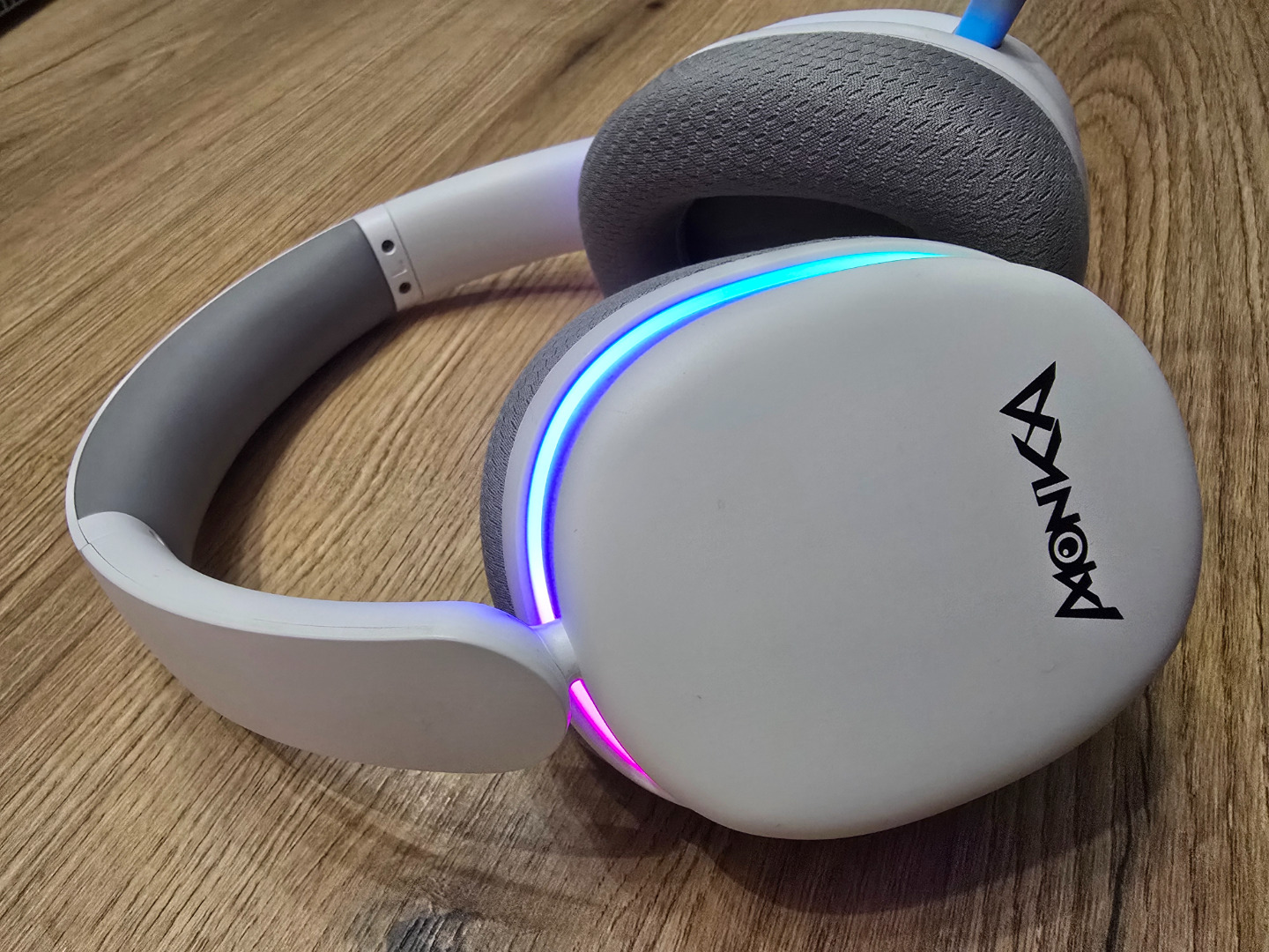 Zasada stara jak świat… Jak coś jest „gamingowe” to musi świecić. Nie inaczej jest w przypadku recenzowanych przeze mnie słuchawek, ale na szczęście da się tę choinkę wyłączyć. Choć kolorowy motyw światełek nie jest specjalnie uciążliwy oraz nie przeszkadza podczas korzystania ze słuchawek, w mojej opinii jest to zbędny bajer, bo po założeniu i tak przecież tych światełek nie widać…