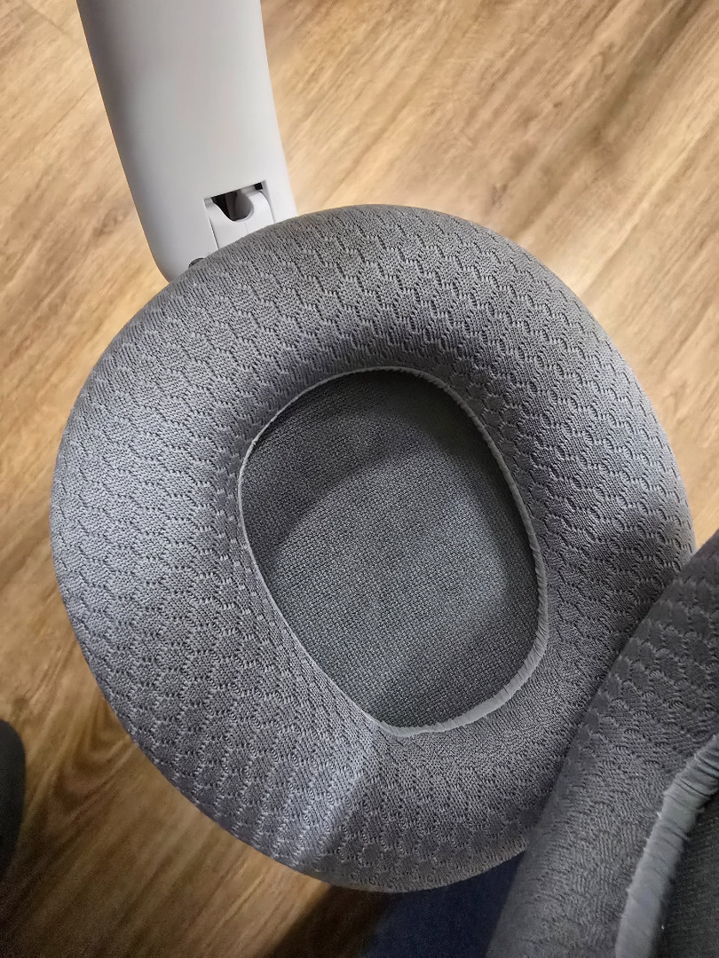 Za wyciszenie słuchawek odpowiada materiałowa powłoka, która spisuje się całkiem dobrze i jest miła w dotyku. Chociaż początkowo bałem się, że będzie się zaciągać o okulary lub szybko się pobrudzi, to moje obawy okazały się bezpodstawne. Przez ponad miesiąc korzystania ze słuchawek, z materiałem nic się nie stało, nie brudzi się, a co najważniejsze, skóra się nie poci nawet podczas długiego noszenia.