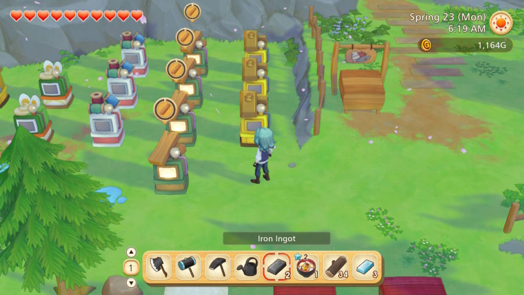 Dostajemy więc już tradycyjnie farmę, a może bardziej obszar do stworzenia tej farmy. Wszystko jest zarośnięte i zapuszczone, nie ma nawet porządnego domu, więc zamiast tradycyjnie wstać pierwszego dnia gry z łóżka i wyjść na pole siać rzepy, musimy zabrać się za wycinanie chwastów, ścinanie drzew i rozbijanie kamieni. Oczywiście nie wszystko da się zrobić od razu, część wymaga ulepszenia narzędzi, a już od samego początku dostępna jest podstawowa kopalnia, która pozwoli nam na rozwój. Na naszej "działce" znajdziemy też stare budynki czy rozwalony most, które za odpowiednią opłatą w zasobach można odbudować i zacząć z nich korzystać. Żeby jednak nie było tak prosto, wprowadzono znane ze Stardew Valley rozwiązanie, czyli maszyny do przetwarzania. Możemy je w podobny sposób budować, stawiając na farmie (i zmniejszając sobie tym samym przestrzeń do sadzenia nasionek) odpowiednie maszyny, które przetwarzają dany surowiec. Zajmują one jednak aż 4 krateczki (2x2), więc tego miejsca dość szybko robi się mało, do tego trzeba je ustawić tak, żeby nie zablokować sobie przejścia. Niestety, gra kładzie wielki nacisk na korzystanie z nich i prawie niczego nie da się zrobić bez przetwarzania, zatem zamiast bawić się i rozwijać stopniowo swoją farmę, zabawa polega na skupieniu się na ustawianiu tych maszyn, a dopiero potem na oczyszczaniu farmy i sadzeniu roślin. Bez nich daleko nie zabrniemy i ich obsługa zjada trochę pędzącego jak pociąg czasu, na szczęście na pewnym etapie chociaż z podlewaniem będzie lżej, bowiem (znów ze Stardew Valley) pojawiają się w grze automatyczne zraszacze. Ponieważ jednak farma dość szybko ponownie zarasta chwastami i drzewami... lekko nie jest. Przynajmniej nie ma też nudów.
