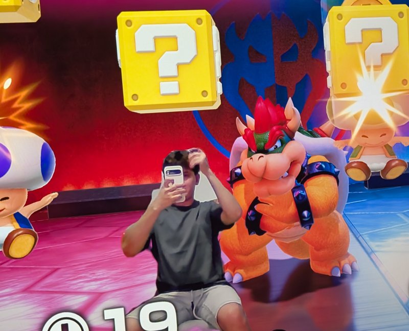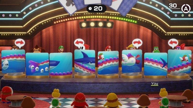 Największą rewolucją miało być Bowser Live, gdzie przeniesieni zostajemy do teleturnieju prowadzonego przez największego antagonistę Mariana. Posiadacze kamery mogą wziąć udział w dodatkowych minigrach, a reszta graczy musi ograniczyć się do zadań wykorzystujących tylko działanie mikrofonu. Krótka sesja podzielona jest na zaledwie trzy wyzwania, gdzie przy użyciu naszej ludzkiej sylwetki musimy na przykład utrzymać jak najwięcej Goomb na głowach, czy jak najszybciej uderzać ręką w wirtualny blok. Część zadań wymaga także podnoszenia głosu, przez co nie jest to najlepszy pomysł na późny wieczór. Niestety całość ogranicza się do zaledwie kilku zadań, które szybko stają się powtarzalne. Ograniczenie trybu do płatnego rozszerzenia wydaje się kompletnie nietrafionym pomysłem, szczególnie gdy wcześniej musimy zorganizować sobie jeszcze kamerkę, za którą Nintendo bierze niemałe pieniądze. Jeśli jednak posiadacie już sprzęt tego typu z wejściem USB-C lub przejściówkę z USB-A na USB-C, to zadziałać powinna także każda inna kamera internetowa.