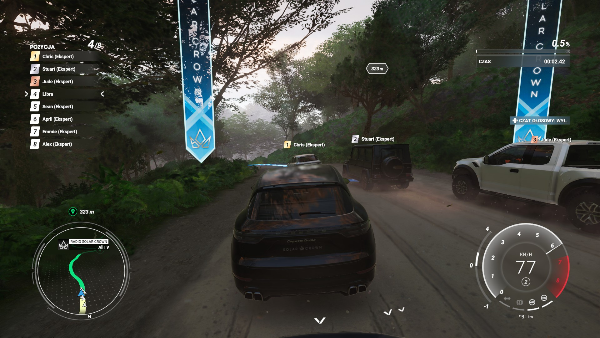 Mógłbym przymknąć oko na warstwę wizualną, gdyby dzięki temu tytuł działał dobrze, ale i pod tym względem jest bardzo źle. Problemy z wydajnością widoczne są na każdym kroku. Zaczynamy wyścig w 60 klatkach, a przy kolejnym okrążeniu w miejscu, gdzie było płynnie, nagle mamy połowę tych klatek. Kuriozalna była sytuacja, gdy podczas jednego z wyścigów inne auto uderzyło w tył mojej maszyny, co spowodowało spadek liczby klatek do około 10, a sytuacja ta utrzymywała się, aż do ponownego uruchomienia gry. Solar Crown potrzebuje nadal wiele pracy nad wydajnością.