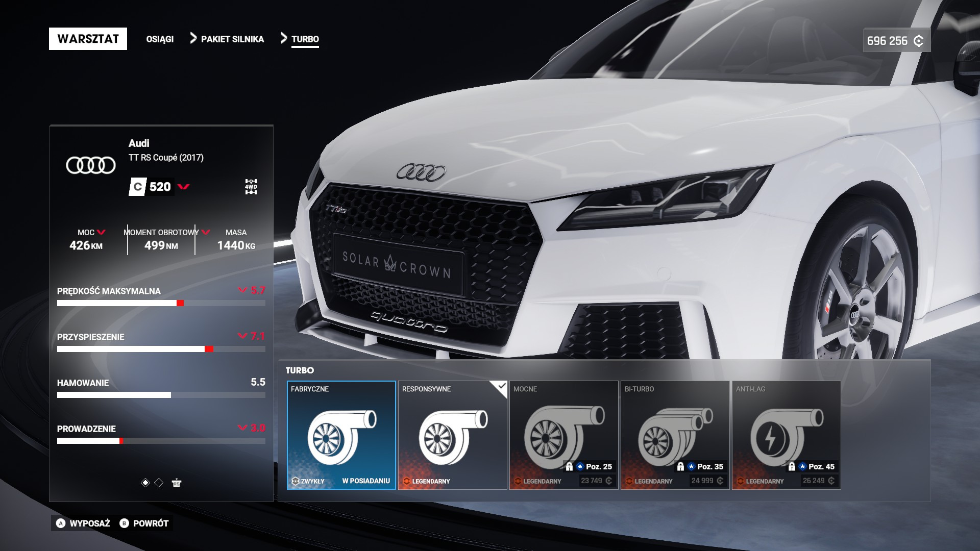 Elementów, o jakie możemy wzbogacić nasz wehikuł, jest cała masa i szybko możemy wypłukać się z gotówki, wpadając do warsztatu na kilka ulepszeń. Kupno samochodu w Solar Crown to niemal symulator nabywania szrota, możecie być pewni, że wpakujecie w nie drugie tyle, co za ile je kupiliście. Opcji ulepszeń jest naprawdę dużo, poczynając od wymiany rury wydechowej, przez układ przeniesienia napędu, na aerodynamice karoserii kończąc. Muszę przyznać, że element ten bardzo przypadł mi do gustu i warsztatach spędzałem sporo czasu. Personalizacja aut jest w Solar Crown bardzo udana.