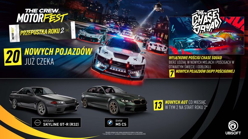 Season Pass na drugi rok życia gry to koszt 119 zł w przypadku wersji na PC oraz 129 zł na konsole. Posiadacze wersji Ultimate mają zapewniony dostęp do przepustki od dnia premiery bez dodatkowych opłat. Co zatem dostajemy w nowym pakiecie? 20 pojazdów udostępnianych stopniowo podczas trwania drugiego roku The Crew Motorfest. Dwa pierwsze samochody są dostępne już od dnia premiery przepustki (BMW M5 CS oraz Nissan Skyline R-32). Kolejne trzynaście wpada w comiesięcznych dropach. Najistotniejszą jednak nowością jest nowy tryb rozgrywki Chase Squad wraz z dedykowaną playlistą i siedmioma "radiowozami". Całą zawartość można zobaczyć także w screenie powyżej akapitu. Skupmy się na razie na nowym trybie rozgrywki, bo tutaj zdecydowanie jest ciekawie.