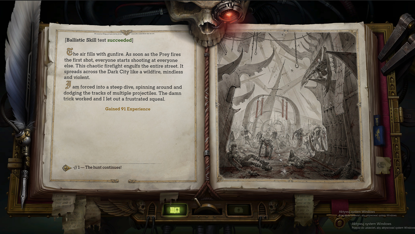 Drugą mechaniką, która bardzo mi się spodobała to rozwiązywanie niektórych wydarzeń w grze w formie paragrafowej! Na ekranie zobaczymy wtedy pewną formę książki z pięknym artworkiem po prawej i opisem tego co się dzieje po lewej. Czytając, co się wydarzy, mamy kilka opcji do wyboru, najczęściej z wykorzystaniem naszych statystyk np. strzał w kogoś, kto nas ściga wymaga „Ballistic Skill”, a im wyższa wartość, tym większa szansa na sukces tej właśnie akcji. Wygląda to fajnie i jest to miły odpoczynek od ciągłych walk, ale to też raczej kwestia tego, że twórcom zabrakło budżetu na stworzenie gameplayowych mechanik, które obecnie są rozpatrywane w ten sposób (np. inwazja na zajętą przez siły Chaosu planetę).