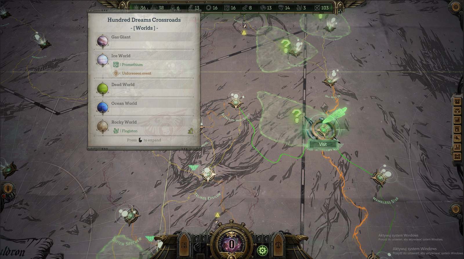 A skoro przy okręcie jesteśmy, zwiedzanie mapy Koronus Expanse odbywa się z poziomu mapy przypominającej te żeglarskie mapy z XVII i XVIII wieku i jest…upierdliwe. Została ona skonstruowana tak, że będąc w danym systemie, skanujemy drogi do innych systemów, a za odkrycie takiej drogi dostajemy jeden punkt Warp. Za te punkty możemy zabezpieczyć ścieżkę do kolejnego systemu, aby była bezpieczniejsza. Niebezpieczeństwo sygnalizują 3 poziomy zagrożenia, im wyższy, tym większa szansa na jakiś zły losowy event w trakcie podróży (najczęściej jest to walka na pokładzie).