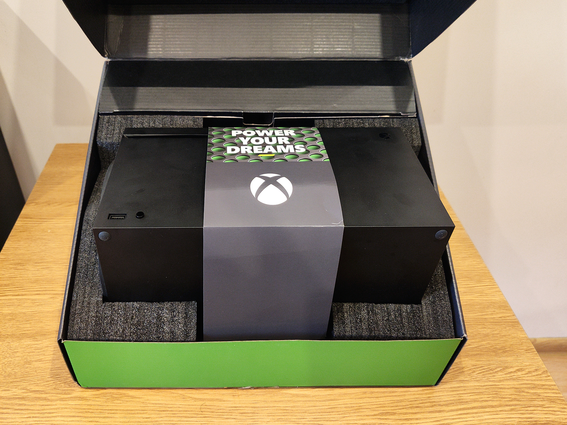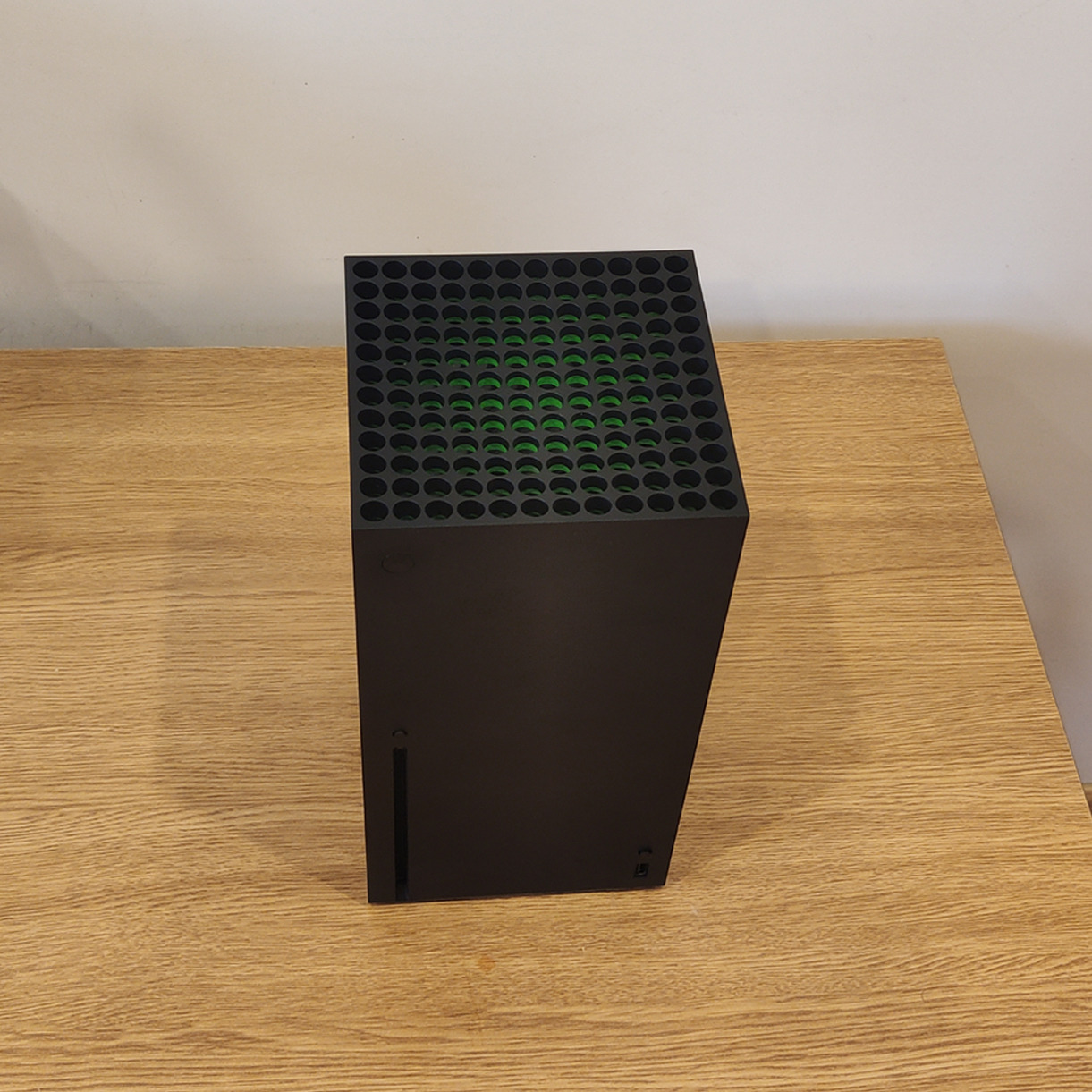 W przeciwieństwie do futurystycznej stylistyki konkurencyjnego PlayStation 5 korporacja postawiła na sprawdzony, minimalistyczny schemat oferując bardzo prostą bryłę w kształcie czarnego prostopadłościanu. Z niemal każdej strony jest ona niezmiennie prosta i pozbawiona wcięć czy zakrzywień, takowe posiadając jedynie na wierzchu urządzenia, gdzie zaobserwować możemy wklęsły wylot powietrza pomalowany nawiązującą do koloru marki zieloną farbą.