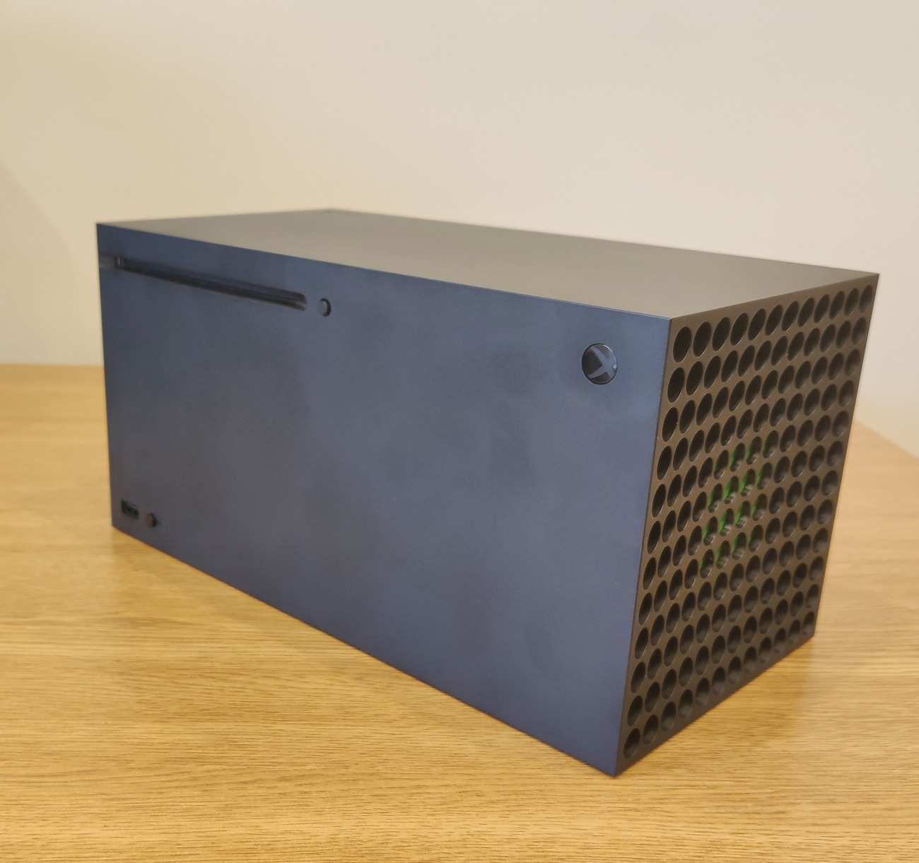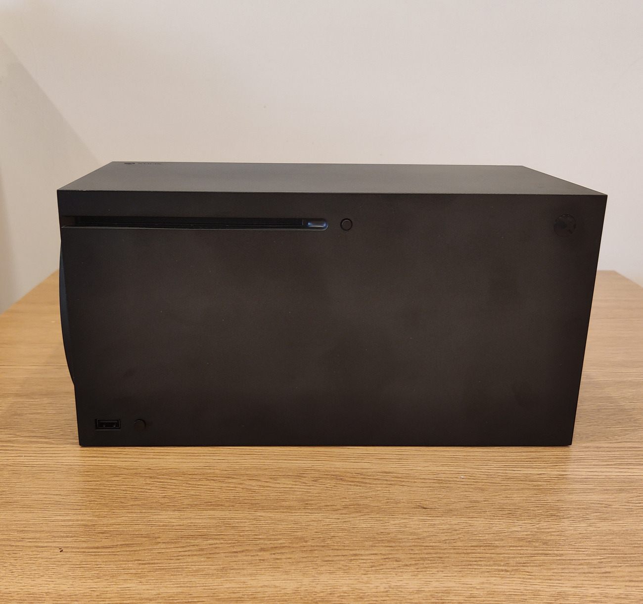 Z przodu konsoli znajduje wspominany napęd 4K Blu-ray, jeden port USB 3.1 typu A, przycisk do parowania pada oraz stylizowany na logo Xbox przycisk do uruchamiania konsoli.