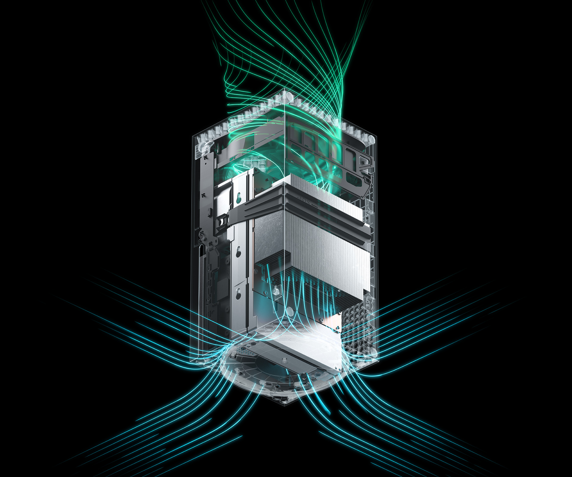 Za chłodzenie podzespołów odpowiada ogromny 130 milimetrowy wentylator umieszczony w górnej części urządzenia. Sprzęt został tak zaprojektowany by odległość pomiędzy głównymi podzespołami generującymi najwięcej ciepła i samym wentylatorem była jak najmniejsza stąd najważniejsze układy oraz ich masywne radiatory znajdują się bezpośrednio pod górną kratką konsoli.