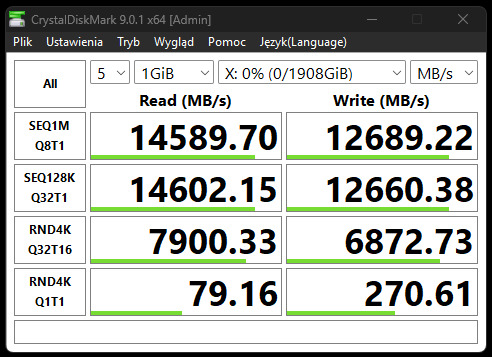 Jak widać na załączonym obrazku, podczas testów udało się przekroczyć deklarowane przez producenta 14 000 MB/s odczytu. Gorzej natomiast wypadł zapis, któremu nie udało się dorównać deklarowanym 13 000 MB/s. Oba wyniki są jednak na tyle dobre, że wątpię, abyście kiedykolwiek mogli odczuć różnicę tych kilkuset MB/s na plus czy minus. Wpływ na wyniki mogła mieć też konfiguracja komputera, na jakim przeprowadzaliśmy testy. Płyta główna, na jakiej zamontowany był dysk to ASRock B650 STEEL LEGEND WIFI. Kilkukrotnie przeprowadzane testy kończyły się u nas podobnymi wynikami.
