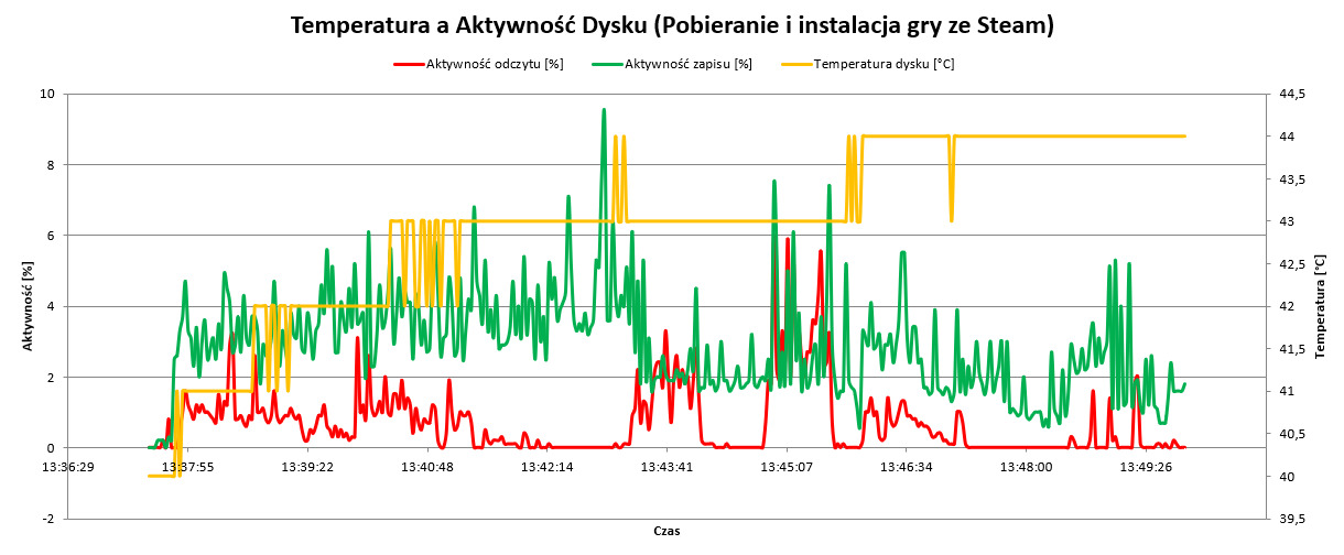 Jak XPG MARS 980 BLADE wypada w zastosowaniach typowo growych? Pod tym względem jest idealnie. Podczas pobierania i instalacji gry z platformy Steam, dysk osiągnął maksymalnie 44 stopni Celsjusza, przez cały czas zapisując z pełną prędkością, z jaką łącze było w stanie ściągać dane.