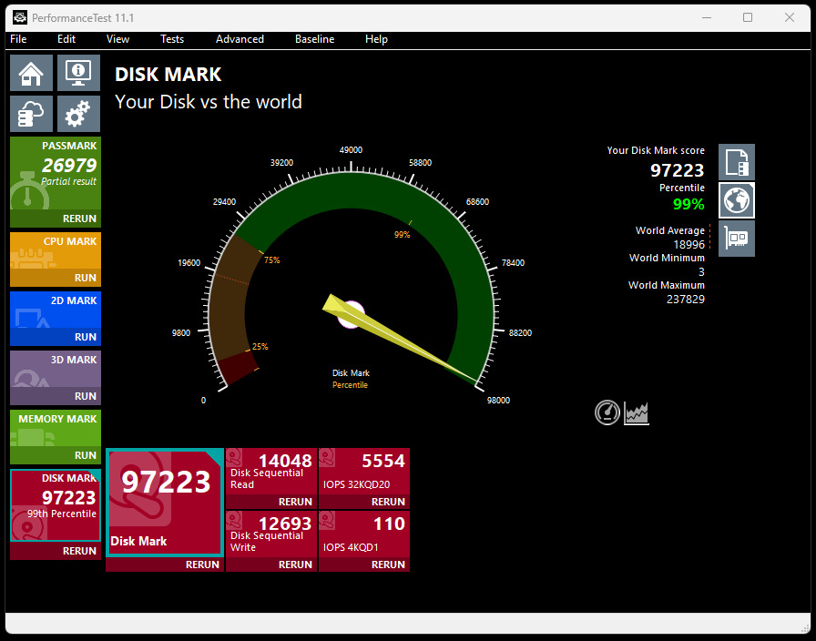 Sprawdziliśmy też jak XPG MARS 980 BLADE wypada na tle konkurencji z wykorzystaniem oprogramowania PerformanceTest od Passmark. Chociaż benchmark znajdujący się na stronie harddrivebenchmark.net umiejscowił go dopiero na szóstym miejscu z 91 361 punktów, to po uruchomieniu benchmarku lokalnie udało mu się uzyskać wynik 97 223 punktów. Biorąc pod uwagę to, że najlepiej oceniany dysk w stawce może pochwalić się 97 702 punktami, istnieje duże prawdopodobieństwo, że MARS zamontowany w innej konfiguracji, zdołałby stać się nowym królem rankingu.