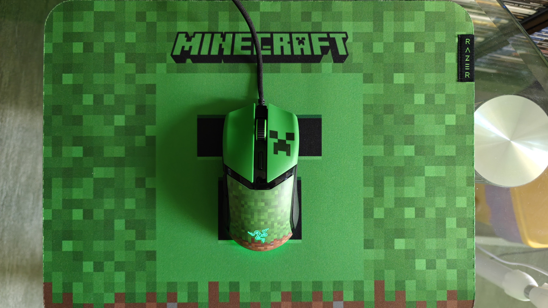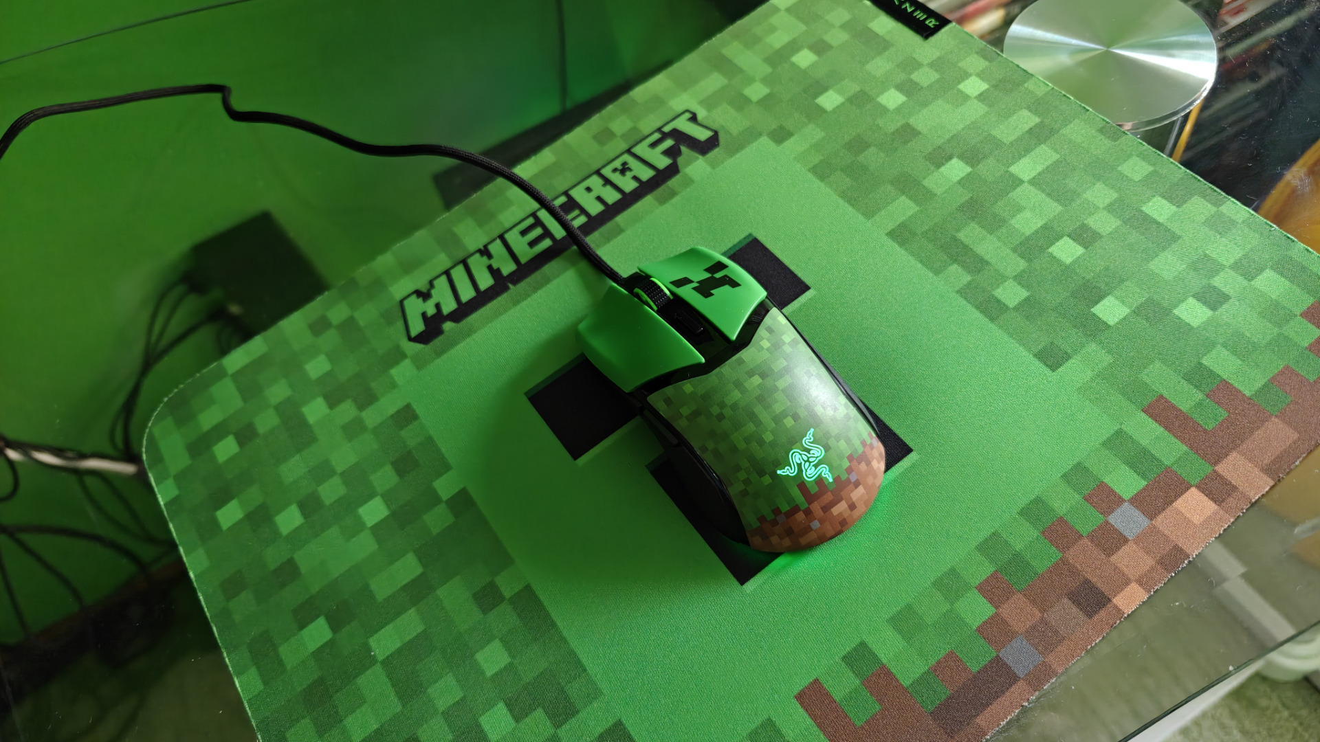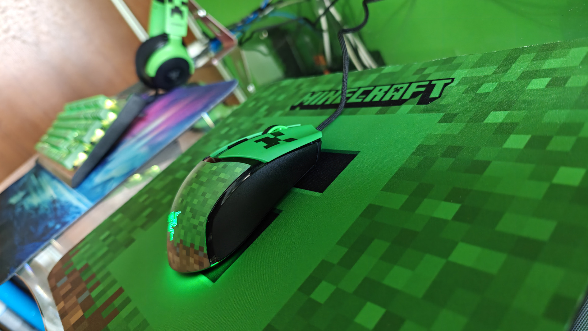 Teraz przejdźmy do gryzonia. Jest nim równie znany i równie sprawdzony model Razer Cobra ze specjalnym malowaniem. Pod spodem równie Minecraftowa podkładka Razer Gigantus V2 prezentuje swe wdzięki.