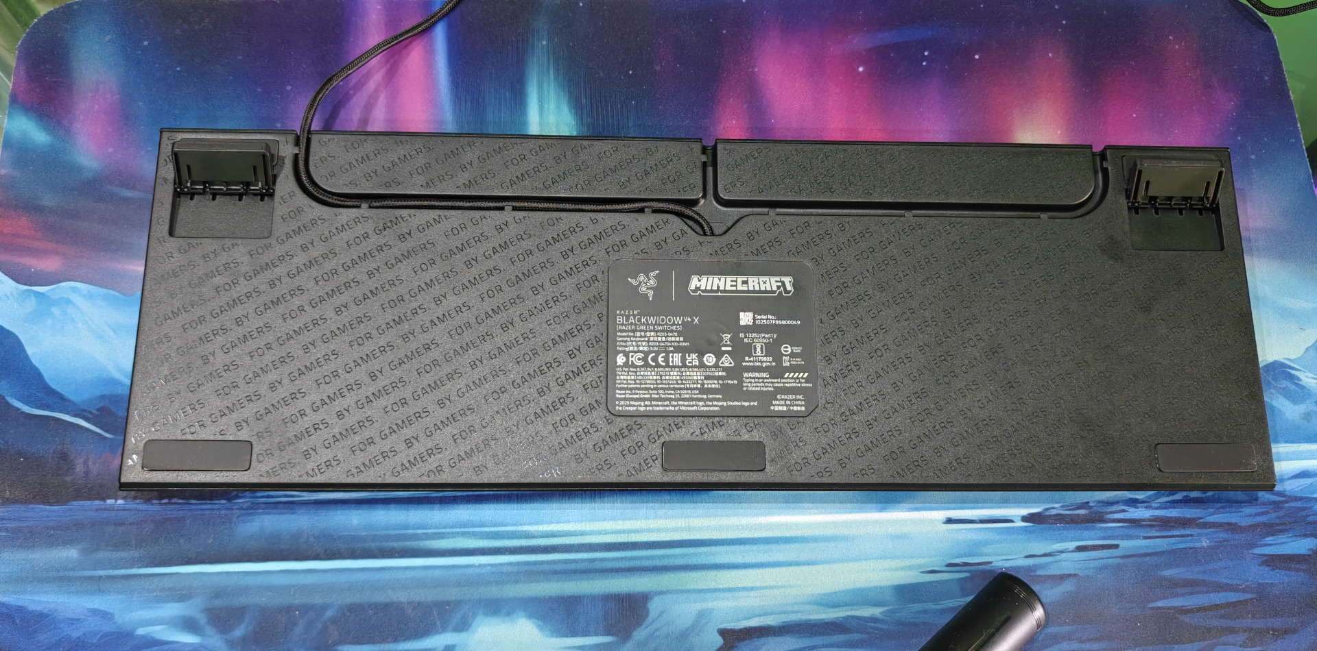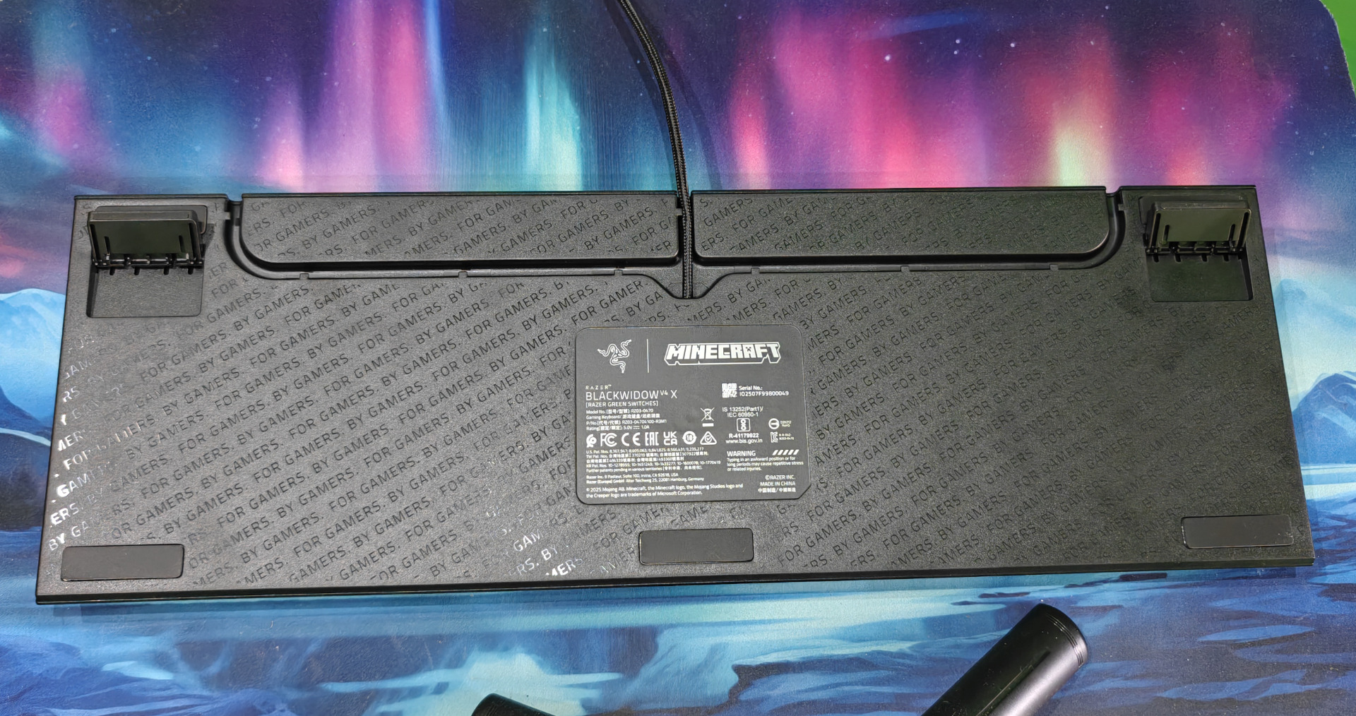 Spód co ciekawe prezentuje się również bardzo interesująco. Na całej powierzchni przetłoczono motto razera "By Gamers. For Gamers", który dodatkowo posiada błyszczącą powierzchnię, dzięki czemu napisy delikatnie pobłyskują i kontrastrują z obudową, co robi solidne wrażenie.