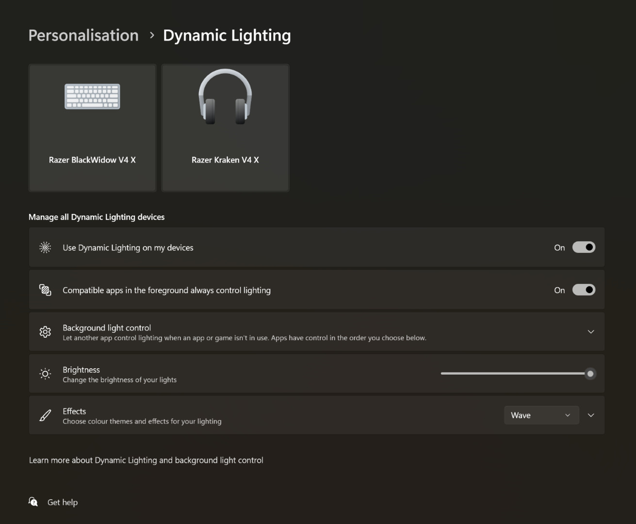 Co ciekawe pod względem programowym mamy też jeszcze jeden plus którego na pierwszy rzut oka można nie zauważyć. Sprzęty są zgodne z wbudowaną w system Windows funkcją Dynamic Lightning, dzięki której również możemy sterować podświetleniem. Jeśli więc nie chcemy instalować oprogramowania Razera, to kolorkami możemy swobodnie sterować z poziomu systemu. Niby powinien być to standard, ale moja klawiatura Roccat nie umożliwia takiej ocji, więc tutaj plus dla Razera.
