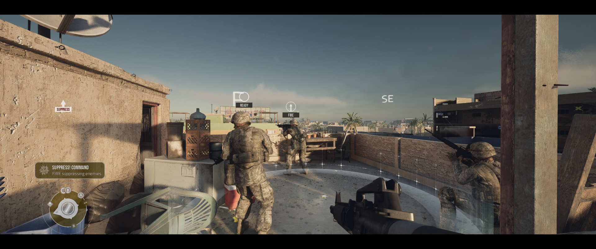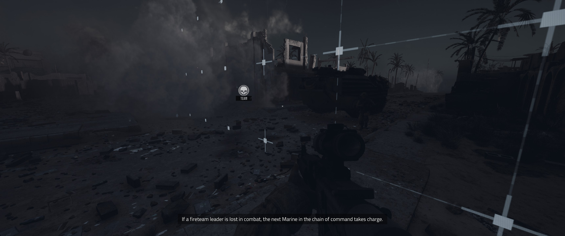 Przejdźmy jednak do mięska, którym twórcy mocno reklamują swoją produkcję — Nasz oddział marines, którym możemy dowodzić. System ten opiera się na kilku rozkazach, które możemy im wydać. Po pierwsze, możemy kazać im udać się w dane miejsce, które wskazujemy celownikiem lub podążać za nami. Kolejnym manewrem jest ogień zaporowy, którym możemy przygwoździć wrogów na danej pozycji, a następnie ich oflankować. Nasi podwładni mogą też bronić wyznaczonego przez nas miejsca. Przy pokonywaniu gęstej zabudowy Faludży przydaje się natomiast możliwość zlecenia naszych podkomendnym staranowania zamkniętych drzwi, gdy my chronimy ich ogniem. Opcji jest tu sporo, więc entuzjaści taktycznej rozgrywki powinni być usatysfakcjonowani. Szkoda natomiast, że poza suchymi odpowiedziami na rozkazy, nasz zespół sprawia wrażenie robotów kompletnie pozbawionych własnego charakteru.