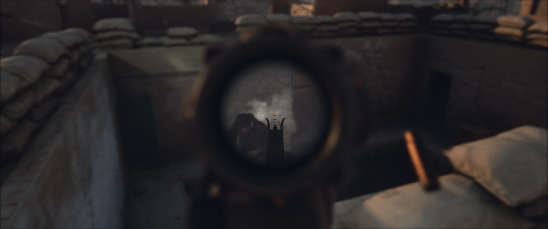Dla tych, których to nie zraziło i czytają dalej, produkcja ta oferuje dosyć specyficzne rozwiązanie w kwestii celowania. Możemy tutaj strzelać z „biodra”, co oznacza bardzo niską celność lub przybliżyć celownik prawym przyciskiem myszy. Brzmi to jak standard, ale w odróżnieniu od większości FPSów, w takiej pozycji dalej nasza celność jest bardzo niska, a sam celownik nie znajduje przed twarzą naszej postaci. Trzymając broń w ten sposób, musimy jeszcze przybliżyć nasze oko do przyrządów celowniczych, korzystając z rolki myszy. Dopiero wtedy mamy maksymalną pewność, że trafimy tam, gdzie chcemy.