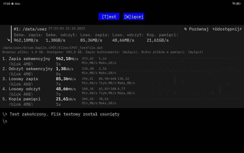 Tym razem zaczniemy sobie od CPDT, który na pliku testowym ważącym 1 GB, uzyskał perfekcyjne wręcz wyniki. Szczegóły znajdziecie w zrzucie ekranu poniżej, natomiast pragnę zwrócić uwagę na bardzo wysoki odczyt sekwencyjny, wynoszący 1,38 GB/s – dzięki temu wiecie, że wszelkie duże aplikacje, w tym gry właśnie, będą odpalać się z błyskawiczną wręcz prędkością.