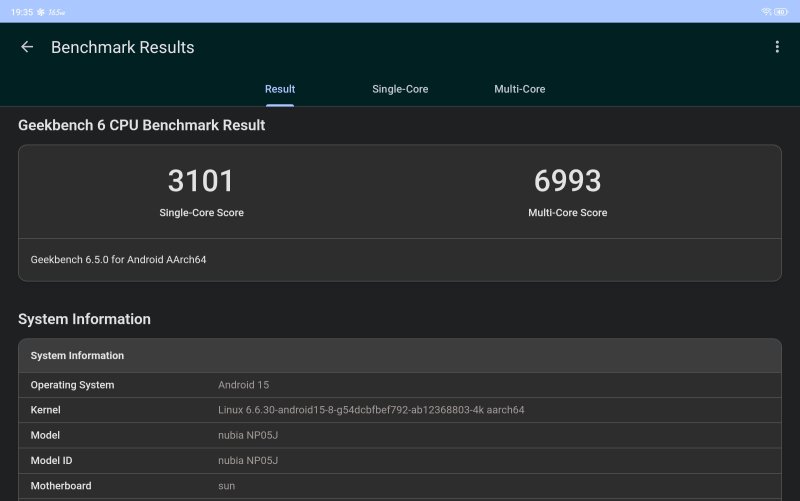 Kolejny na tapet weźmiemy Geekbench 6, a zaczniemy od wyniku testów CPU, który wyniósł 3101 punktów dla pojedynczego rdzenia oraz 6993 punkty przy wykorzystaniu wielu rdzeni. Porównując to do niedawno sprawdzanego Samsunga, Redmagic Astra wypada lepiej w wyniku jednordzeniowym (3101 vs. 2717) i zauważalnie gorzej, jeżeli mowa o wykorzystaniu wielu rdzeni (6993 vs. 8683).