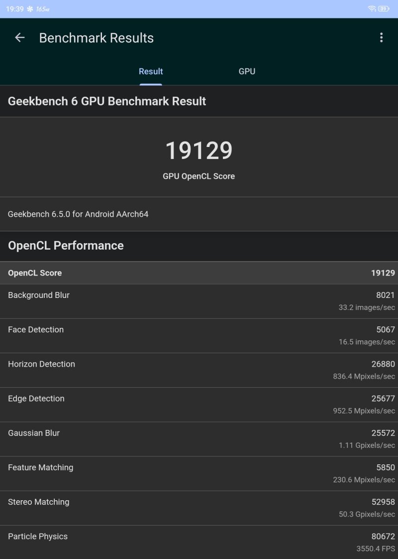 W standardzie OpenCL wynik GPU wyniósł 19129 punktów, co jest nieco niższą wartością, niż ta osiągnięta przez Galaxy Tab S11 (20402 punkty). Propozycja od Redmagic okazała się lepsza jedynie w wartościach OpenCL takich jak Horizon Detection (26880 vs. 22803), Edge Detection (25677 vs. 21215) i Particle Physics (80672 vs. 74673).