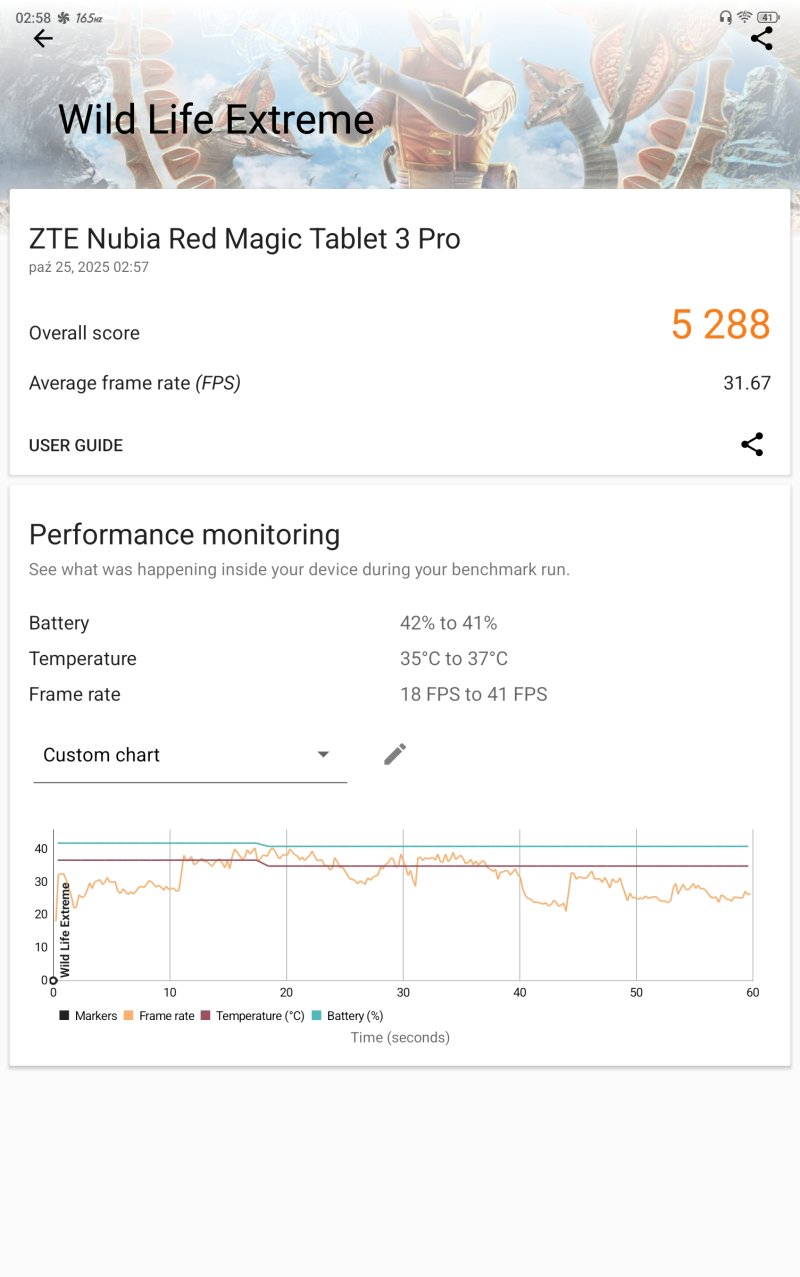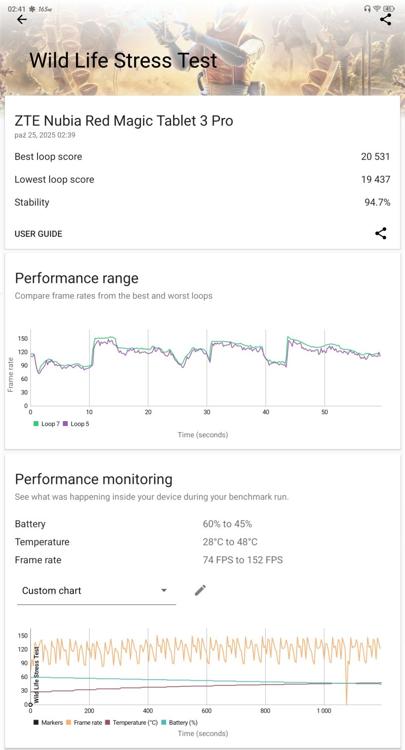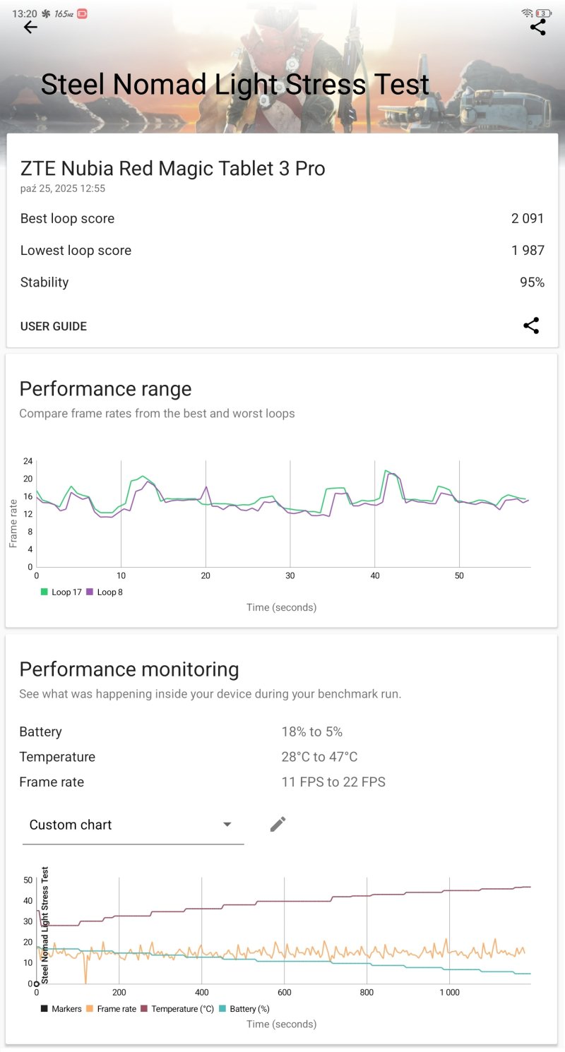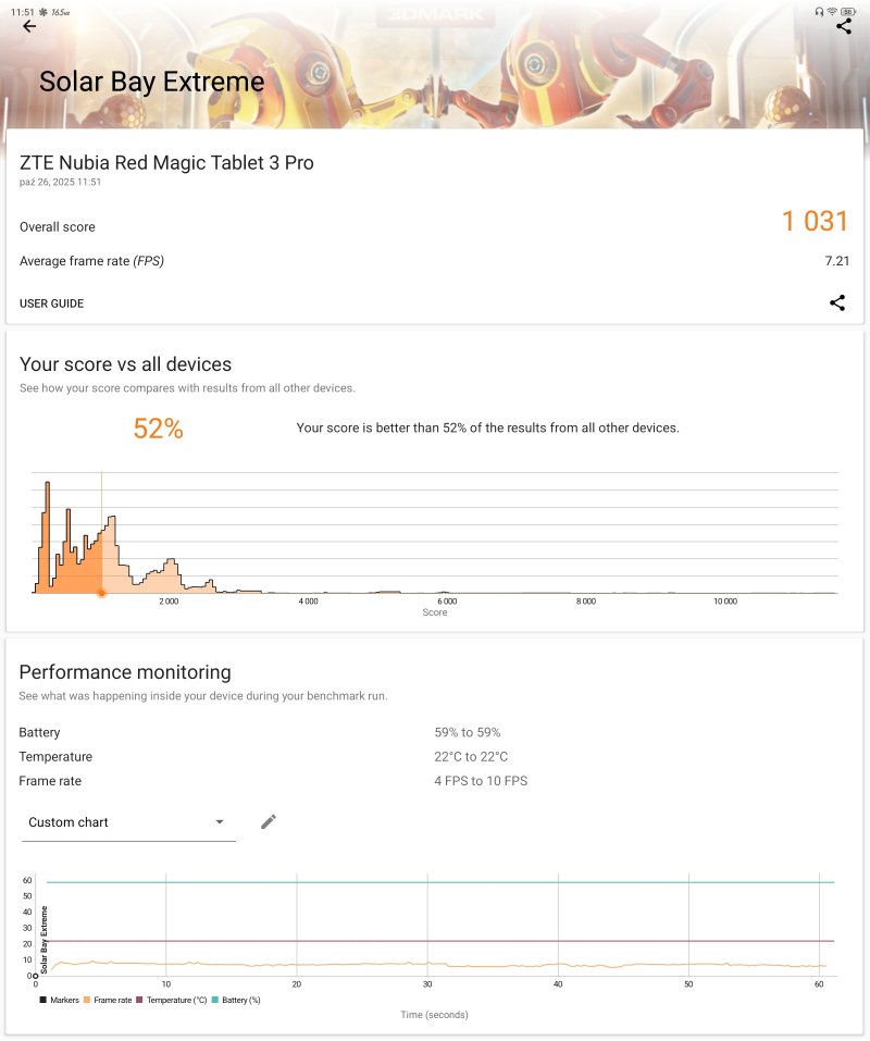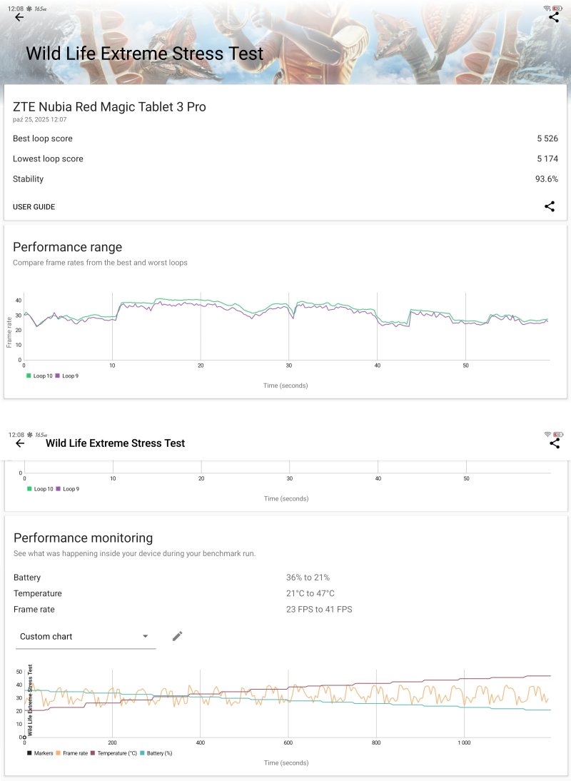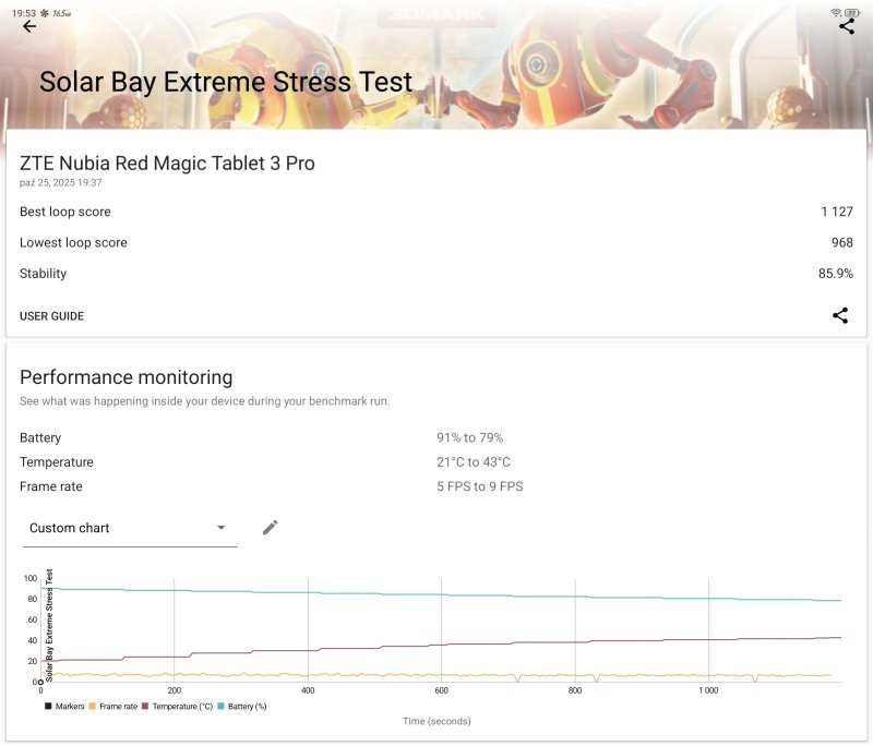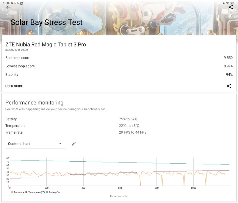 Solar Bay Stress Test z kolei aż tak łaskawy nie był i choć tablet osiągnął bardzo dobre wyniki punktowe, tak na wykresie widać, że wraz ze wzrostem temperatury, Redmagic Astra miał coraz większe problemy z utrzymaniem stabilności.