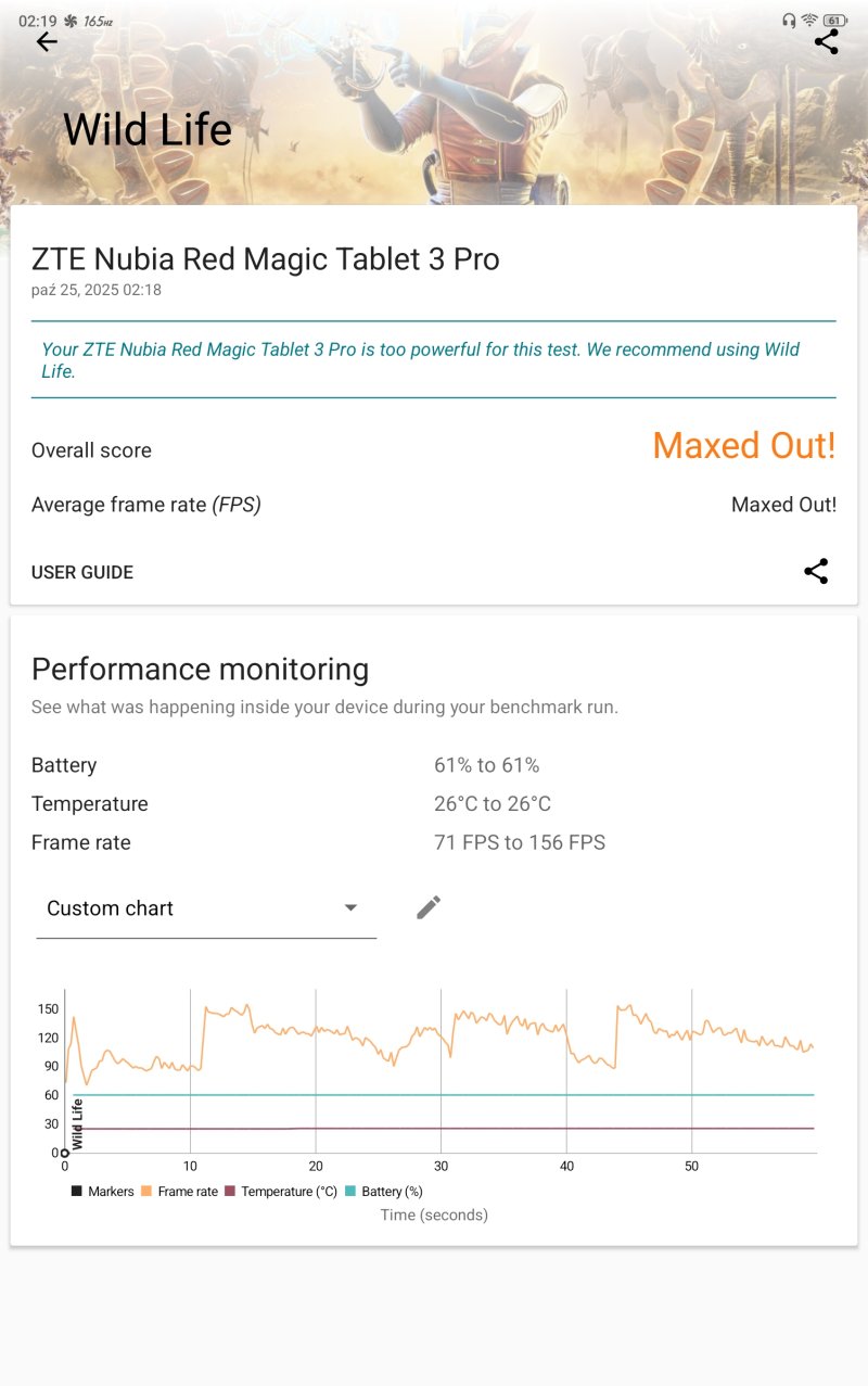 Co ciekawe, rekomendacja ta również nie okazała się najmniejszym wyzwaniem dla tego sprzętu i tablet wymaksował wynik podstawowej wersji, w ogóle się przy tym nie pocąc. Nie stracił ani procenta baterii, temperatura nie wzrosła nawet o stopień, a najmniejsza wartość FPS wyniosła 71.